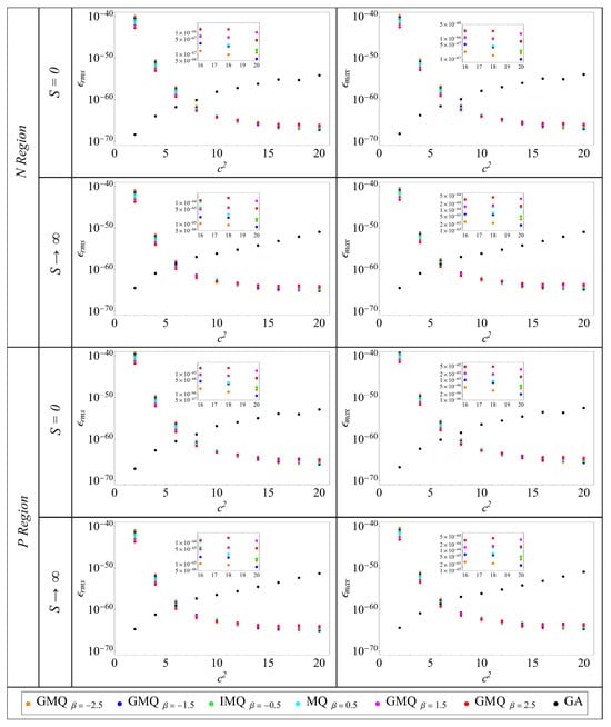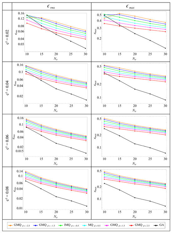 Figure 3 shows the variation of and with respect to the shape parameter in the range for and . These results are obtained with , and the recombination rate is chosen to be to represent the case, since density distributions become insensitive to above this value. The high-level accuracy of GMQ improved with increasing , and good stability is observed for all exponent values. Although the error of GA increases with increasing , GA collocation still provides a high accuracy for all cases. This basis function provides higher accuracy and converges faster than GMQ when . The stability plateaus of all basis functions, the minimum error values, and condition numbers that correspond to the upper limit of the stable range are presented in Table 1. The limiting values are the shape parameters, where a slight increment is observed in rms and maximum errors.