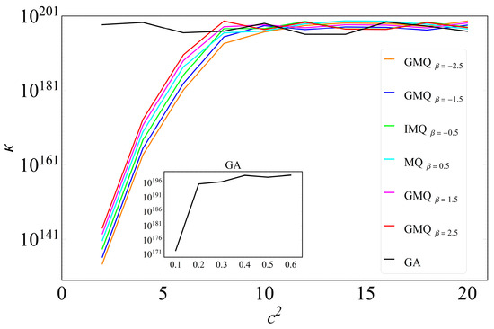 The variation in the condition number with the shape parameter for all basis functions is illustrated in Figure 4. The safe limit for the condition number, , is reached for the GMQ at ; however, as Table 1 indicates, the collocation method converges smoothly up to for . Such behavior is also observed for the Poisson equation [35]. On the other hand, GA becomes unstable at at which also reaches the ill-conditioning limit.