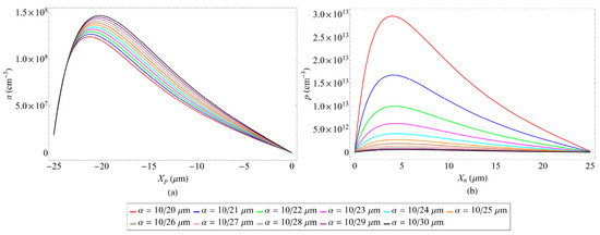Impact of absorption coefficient on (a) electron and (b) hole carrier densities, where .