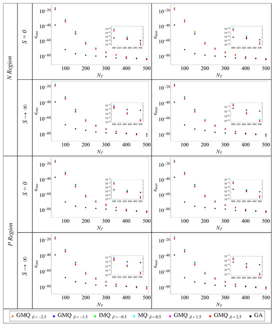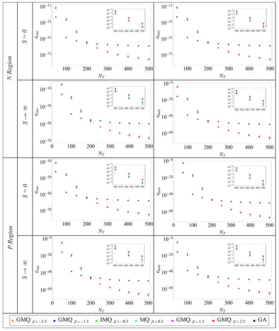 To test the robustness of the global RBF collocation method, calculations are performed for and , and the results showing the node number convergence of the meshless algorithm are presented in Figure 8 and Figure 9, respectively, where the shape parameter is chosen as . Diffusion lengths of are assumed to represent the case. A comparison with the convergence curves of Figure 4 reveals that similar error behavior is present for all RBFs in both N and P regions and surface recombination rates. Increasing the value of improves the accuracy of the method, while GA collocation yields the best convergence rate for sparse node configurations. The shape parameter convergence of the and cases are also studied, and the convergence curves are similar to those presented in Figure 3.