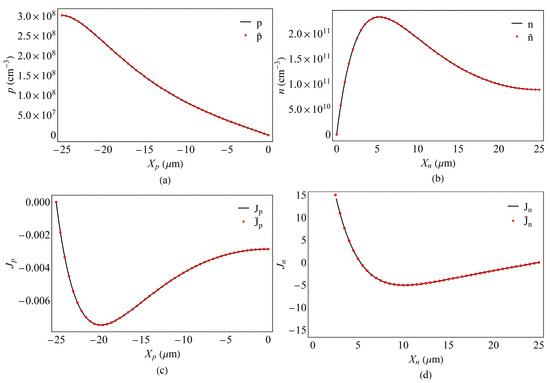 The accuracy of the meshless method is further illustrated in Figure 10 through the comparison of analytical and numerical solutions for , , and where . RBF collocation solution is obtained with the MQ basis function employing and . Results clearly show that the numerical electron, hole, and current densities exactly match the analytical solutions.