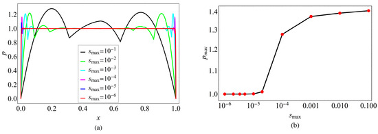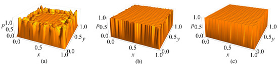 The two-dimensional current continuity equation, Equation (2), is solved with , , , [25] on a domain of the unit square. This problem does not have an analytical solution, and to evaluate the performance of the global RBF collocation method, FEM is applied to Equation (2). Triangular finite elements are used within the solution, and the FEM solver of Mathematica’s built-in function NDSolve is utilized for computations. Maximum mesh length, , has a significant impact on the solution as observed from the FEM solutions obtained with various maximum mesh lengths illustrated in Figure 11 and Figure 12. Based on these results, the FEM solution with , which minimizes the oscillatory behavior near the boundaries, is chosen as the reference solution of the two-dimensional single region problem. The high fidelity of the numerical solution employing is obvious from Figure 12b, where it is seen that numerical artifacts (i.e., numerical values larger than 1) that are quantified by vanish completely when .