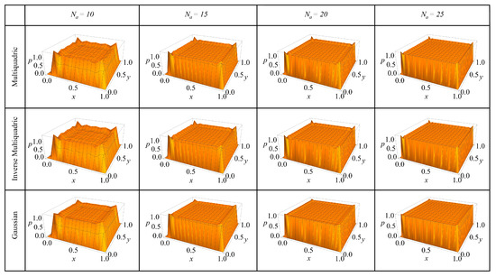 In Equation (8), is referred to as the shape parameter and has a significant impact on the accuracy and stability of the RBF collocation method. In the case of function interpolation, larger values of tend to improve the accuracy of the approximation for the sake of ill-conditioning and hence decrease the stability of the method [28]. A similar behavior is also observed for the RBF collocation solution of PDEs [29]; however, the ill-conditioning problem can be overcome by increasing the precision of computation [30], optimization of the shape parameter [31], or matrix preconditioning [32]. The exponent of the GMQ, , has an effect that is similar to the impact of on the performance of the RBF collocation method. A larger is preferable in terms of accuracy; however, increasing also decreases the stability of the method. GMQ is referred to as the multiquadric (MQ) and inverse multiquadric (IMQ) when is chosen to be and , respectively.