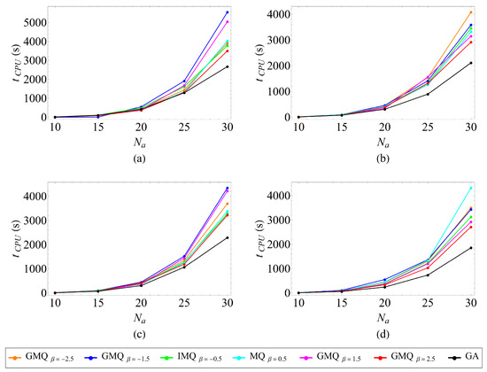 Variation in RBF collocation CPU time with for (a) , (b) , (c) , and (d) .