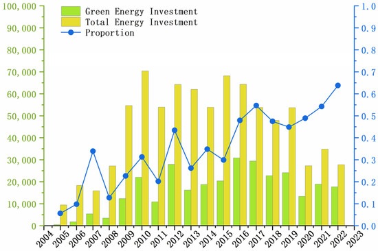Policy plays a significant role in influencing investment. Governments in emerging markets can stimulate investment and foster enterprise development through institutional support and the formulation of effective policies [32]. Home country institutions, in the form of policies, can significantly influence the willingness and capacity of emerging market firms to make overseas investments by providing financial support, information, protection, and other channels [33]. The BRI has notably diminished policy uncertainty in host countries [34] and mitigated the adverse effects of host country political risk [35] on China’s overseas investment. Regarding the relationship between the BRI and energy transition, existing studies have found that the initiative not only promotes China’s overseas green energy investments [22] and projects [23], but also enhances renewable energy financing by Chinese policy banks [36], contributing to the energy transition [37]. Early investment endeavors by China in BRI countries were primarily concentrated in the energy and mining sectors, particularly focusing on traditional energy sources. In 2021, China made a commitment to refrain from constructing any new overseas coal power projects and pledged robust support for the advancement of green energy in developing countries. Among the eight actions outlined during the Third “Belt and Road” International Cooperation Summit Forum, there is a clear emphasis on promoting green development, which includes fostering cooperation in green infrastructure, green energy, and green transportation. These actions demonstrate China’s determination to tackle climate change. Currently, China has emerged as the largest contributor to global energy transition investments. China’s cumulative energy transition investments have reached half of the global total. In 2023, China’s energy transition investment reached $676 billion, representing 38% of the total global energy transition investments [38]. China’s investment in BRI countries has transitioned towards clean energy and eco-friendly investments, with investments in green and low-carbon energy already surpassing those in traditional energy sources. As Figure 1 shows, after 2013, the proportion of China’s green energy projects has been on an overall upward trend. Drawing upon the preceding analysis, this paper proposes the first hypothesis: