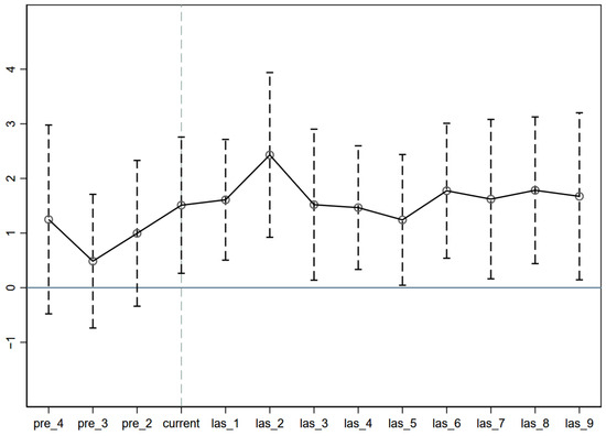 The “parallel trends” assumption constitutes the central premise of difference–differences methodology [72]. This hypothesis suggests that although the treatment and control groups may have had different levels of outcomes prior to the start of treatment, they should have had the same trend in outcomes prior to treatment, implying that any differences in outcomes between control and treatment groups are attributable to the policy and not to differences in pre-existing trends in outcomes [73]. Specifically, the pre-implementation year is set as the baseline period to examine the dynamic effects before and after the introduction of the initiative. As illustrated in Figure 3 and Table 4, the results reveal that the treatment and control groups followed parallel trends before the implementation, validating the parallel trend assumption. The joint pre-trend test indicates that the null hypothesis that all pre-treatment coefficients are jointly equal to zero cannot be rejected (F = 1.20, p = 0.3160), suggesting that the parallel trends assumption holds. The catalytic effect of the BRI on green energy projects was evident in the year it was proposed. With the extension of the policy implementation time, the marginal effect waned from 2015 onwards, which can be attributed to the transition from the initial phase of intensive promotion to a more refined phase of implementation. In addition, the establishment of the Belt and Road International Alliance for Green Development in 2019 and China’s announcement in 2021 that it will no longer build new overseas coal projects signaled a renewed focus on sustainability and green cooperation in the BRI, which has strengthened and sustained the promotional effect of green energy projects.