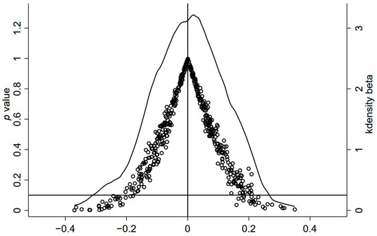 Although a series of time-varying country-level characteristic variables have been controlled for in the previous process of identifying policy effects, and year fixed effects have also been added to control for country characteristics that do not vary over time, there may still be interference from omitted variables, random factors and other potentially confounding variables. To eliminate interference, this paper conducts a placebo treatment group test on the main results by randomly selecting countries as a “dummy” treatment group for analysis. First, 50 host countries are randomly selected from all observed countries, which are set as the “dummy” treatment group, and the remaining countries are set as the control group, whereby a randomized experiment is constructed for the regression. Because the treatment combination control group was randomly generated, the “dummy” crossover coefficient in the placebo test should be 0. To verify the robustness of the findings, the process was repeated 500 times. The distribution of the estimated coefficients for bri × after, the kernel densities of the estimated coefficients for the group of 500 randomly generated treatments, as well as the distribution of the corresponding p-values, are shown in Figure 4. The estimated coefficients for bri × after are centrally clustered around 0. The majority of the p-values are above 0.1. Compared to the “dummy” estimated coefficients (clustered in [−0.4, 0.4]), 0.906 (the actual estimated coefficient) is much larger, suggesting that the result is unlikely to have occurred by chance. Based on the above information, it can be concluded that the core conclusions obtained are robust.
