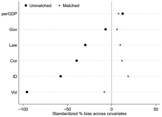 This paper adopts the propensity score matching (PSM) analysis to mitigate sample selection bias and further test the causal relationship between the BRI and the growth of China’s overseas green energy projects. Specifically, nearest-neighbor matching within a caliper of 0.05 is adopted as the matching method. GDP per capita (perGDP) and institutional variables (ID, Gov, Cor, Law, and Voi) that can reflect the key economic and institutional environment are selected as covariates to estimate the propensity score using a logit model. The matched samples have been better balanced in covariate (Figure 5), and the difference between the treatment and control groups was significantly lower after matching compared to before matching. The result of the benchmark regression after performing PSM is shown in Table 7. The bri × after correspondence coefficients are positive and significant at the 1% level after matching, fully consistent with the unmatching benchmark result.