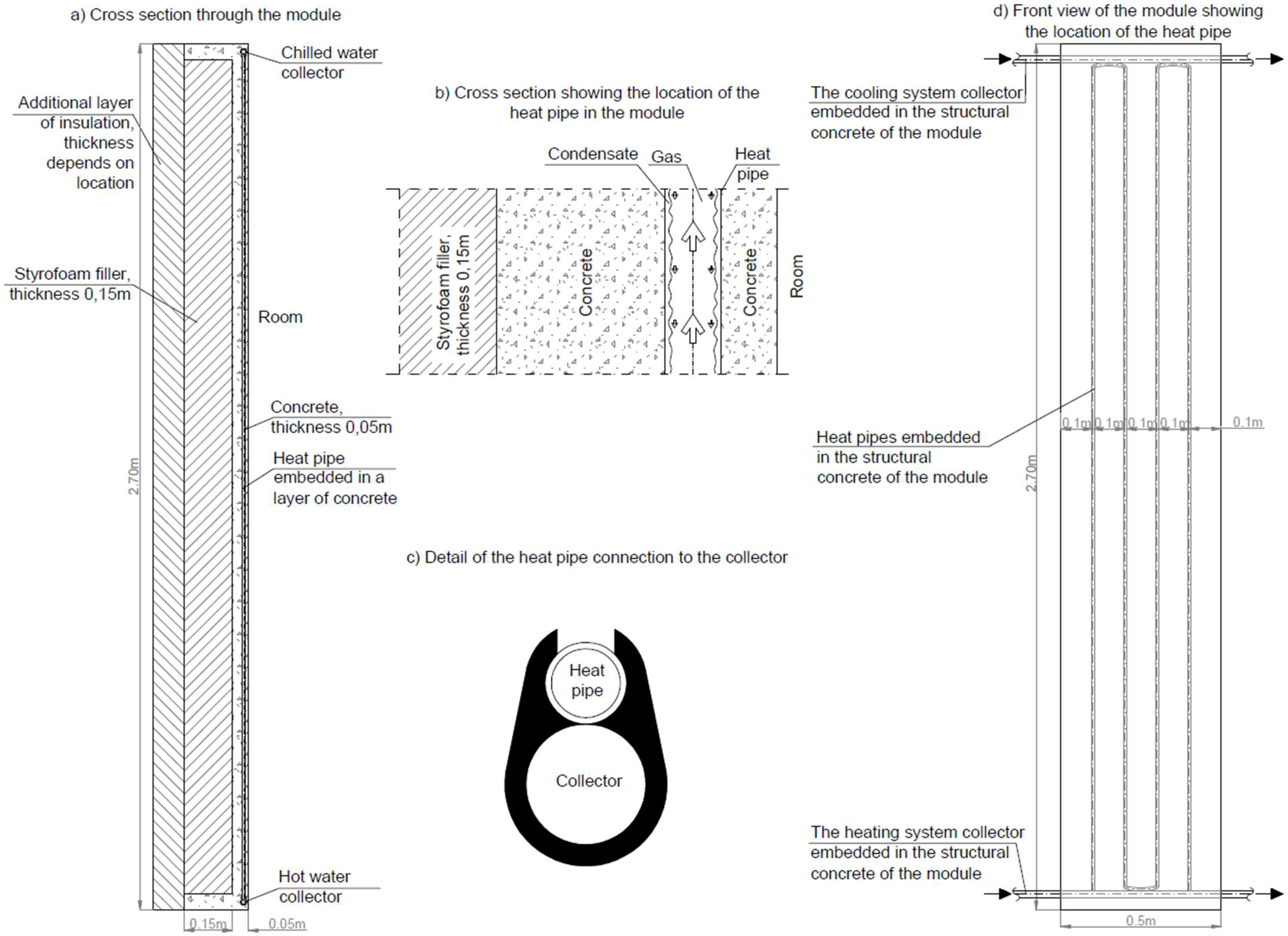 The heating and cooling module is a wall module with a thickness of 0.2 m—on the front side a 0.05 m thick reinforced concrete slab, inside 0.15m of polystyrene. The module is 2.7 m in height and 0.5 m in width. In front of reinforced concrete, a steel heat pipe filled with a phase-change thermodynamic medium is located vertically. Heat pipes are connected to the two feed water collectors (hot and cold), which are embedded horizontally in the front part—hot water at the bottom and chilled water at the top.