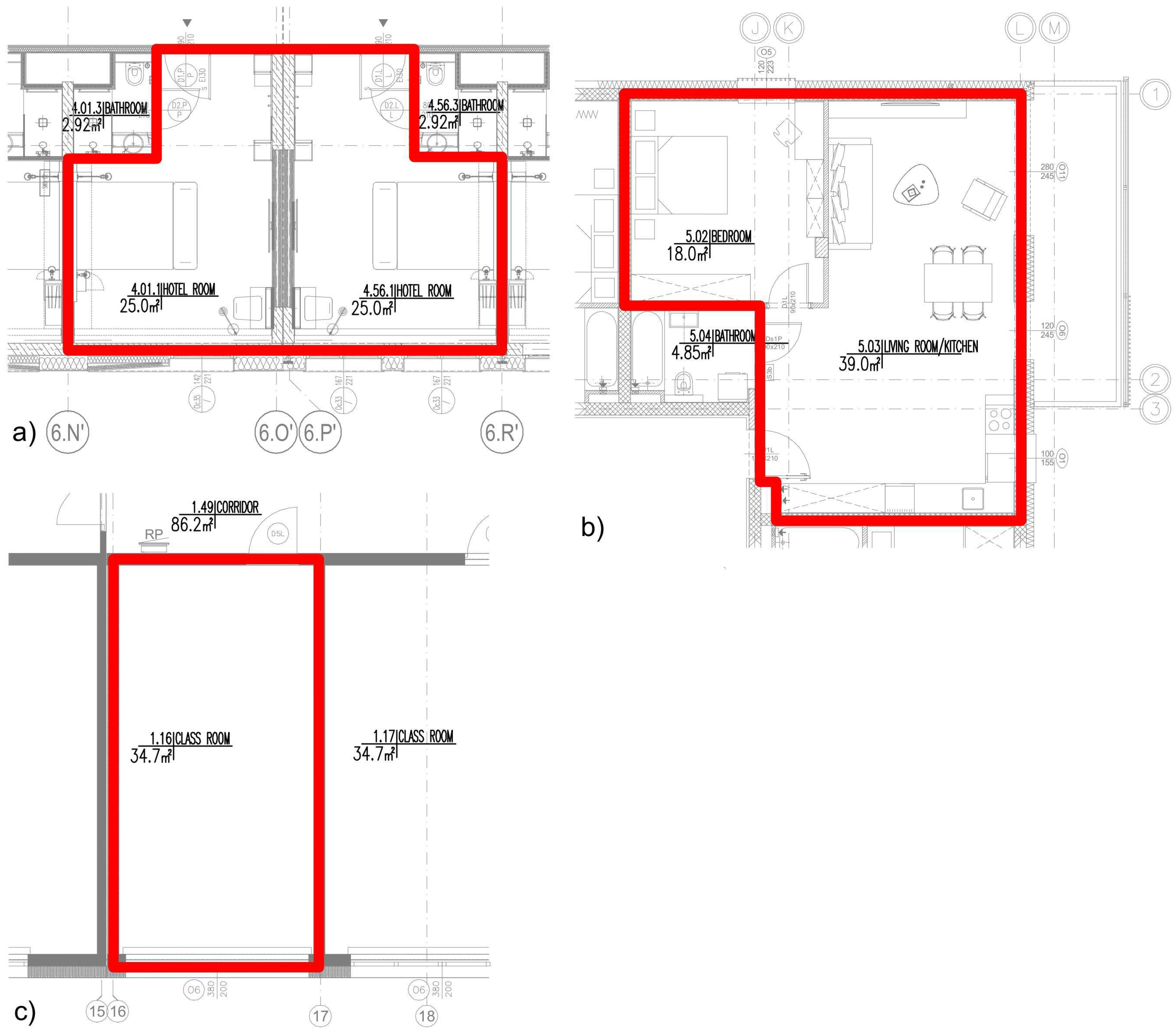 For analysis, we selected the building module tested in the Air Conditioning and Heating Department of the Warsaw University of Technology, as part of the project No. RPMA.01.02.00-14-9558/17 “Innovative and ecological heating and cooling system with composite prefabricated wall elements”, supported by the Regional Operational Program of the Mazowieckie Voivodeship, and the research grant no. 2/ILGiT/2023 of the Warsaw University of Technology, supporting the scientific activity in the discipline of Civil Engineering, Geodesy, and Transport.