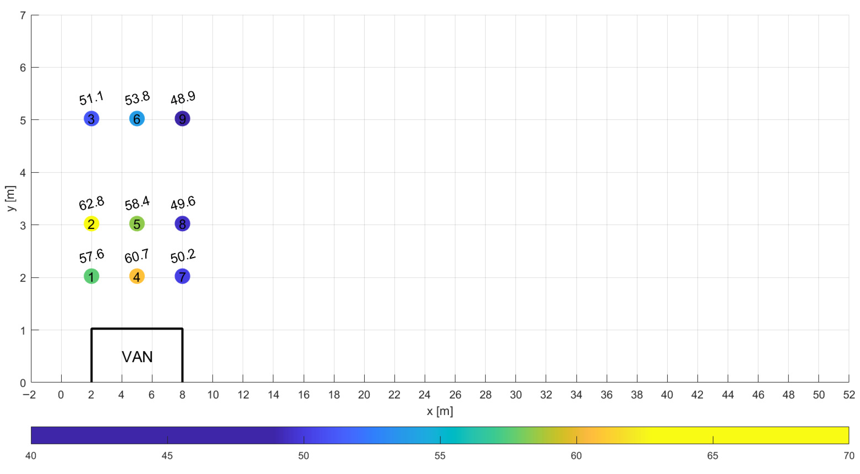 Figure 8), the highest A-weighted sound pressure levels were recorded at points 4, 6, and 5 in the second cross-section, while the lowest levels were measured at points 3, 9, and 2 in the first and third cross-sections. The peak A-weighted sound level was 67.3 dB at point 4, 1 m from the vehicle, while the minimum was 52.0 dB at point 3, 4 m from the van. The largest difference in A-weighted sound levels was observed in cross-section 1 between points 1 and 2, amounting to 4.1 dB, whereas the smallest difference of 0.9 dB was found between points 6 and 5 in cross-section 2. The most uniform distributions of A-weighted sound levels were 3.4 dB in cross-section 2, 6.7 dB in cross-section 3, and 7.5 dB in cross-section 1. The greatest non-uniformity in the analyzed area was 15.3 dB.