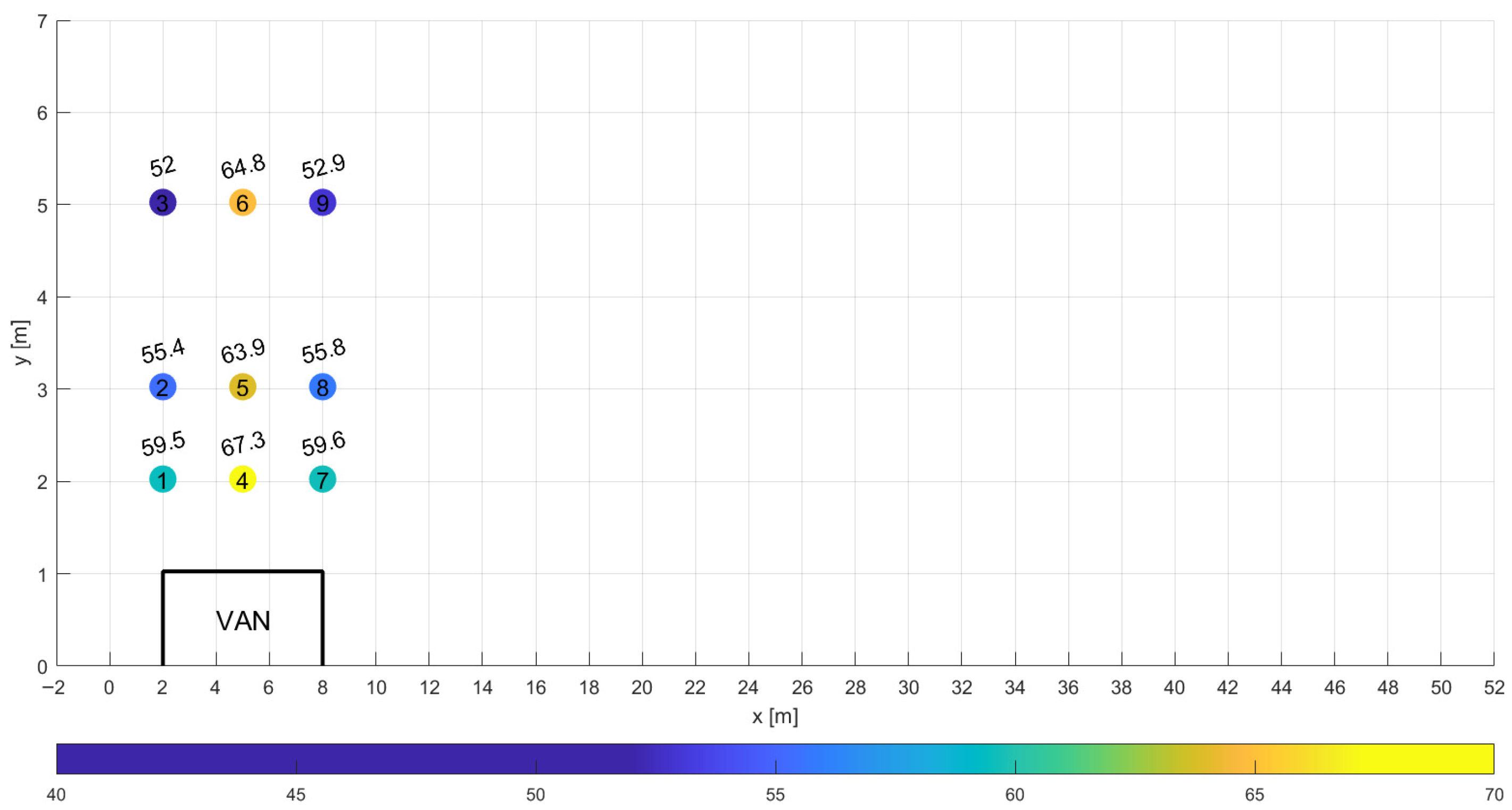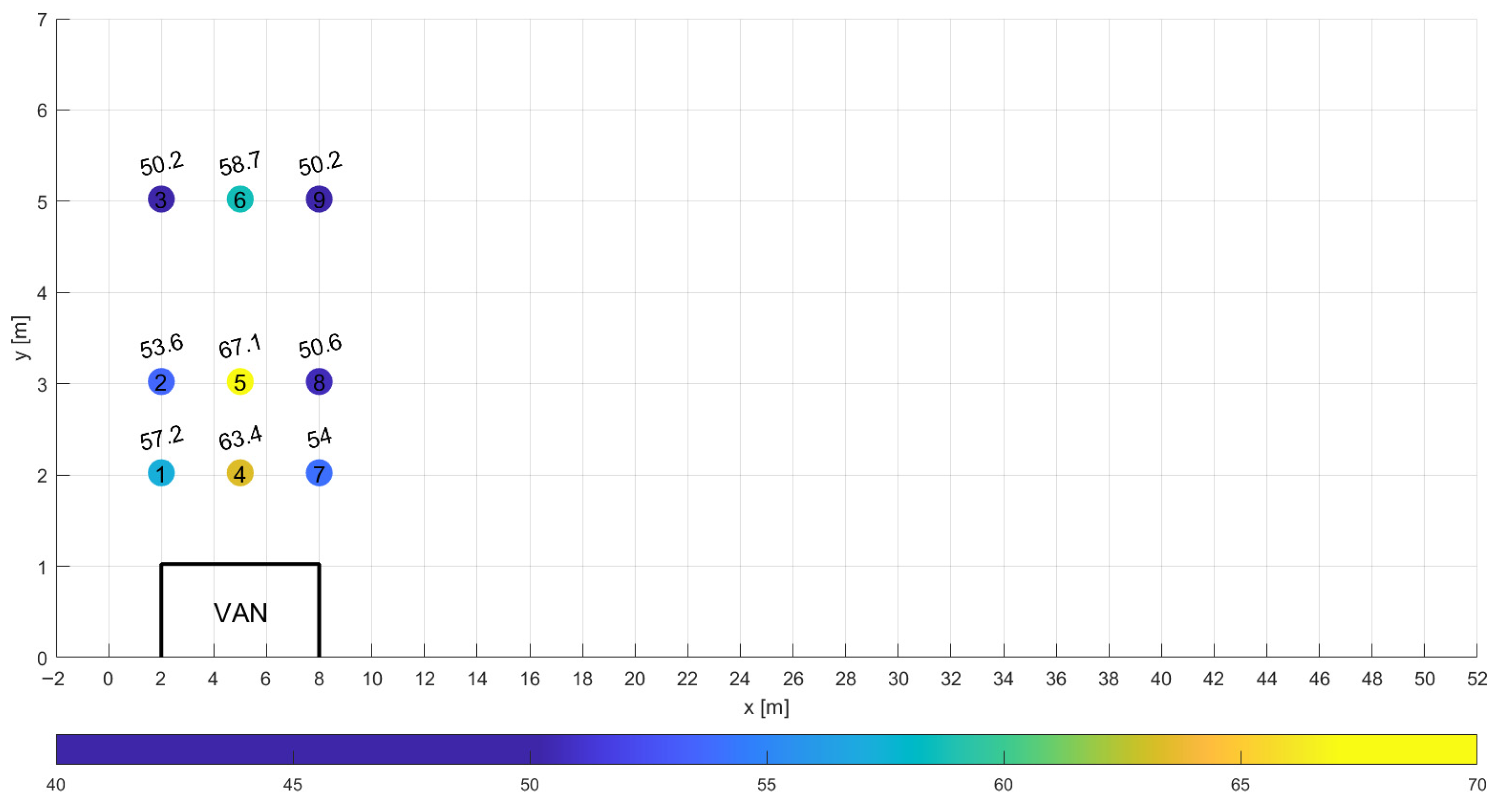 Figure 7), the highest A-weighted sound pressure levels were observed at points 5, 4, and 6, corresponding to the second cross-section, while the lowest levels were recorded at points 9, 3, and 8, located in the third and first cross-sections. The maximum A-weighted sound level was 67.1 dB at point 5, at a distance of 2 m from the vehicle, and the minimum value was 50.2 dB at points 9 and 3, both situated 4 m from the van. The greatest difference in A-weighted sound levels was detected in cross-section 2 between points 5 and 6, amounting to 8.4 dB, whereas the smallest difference of 0.4 dB was recorded between points 8 and 9 in cross-section 3. The most uniform distributions of A-weighted sound levels were 3.8 dB in cross-section 3, 7.0 dB in cross-section 1, and 8.4 dB in cross-section 2. The highest non-uniformity of A-weighted sound levels between individual points in the analyzed area reached 16.9 dB.