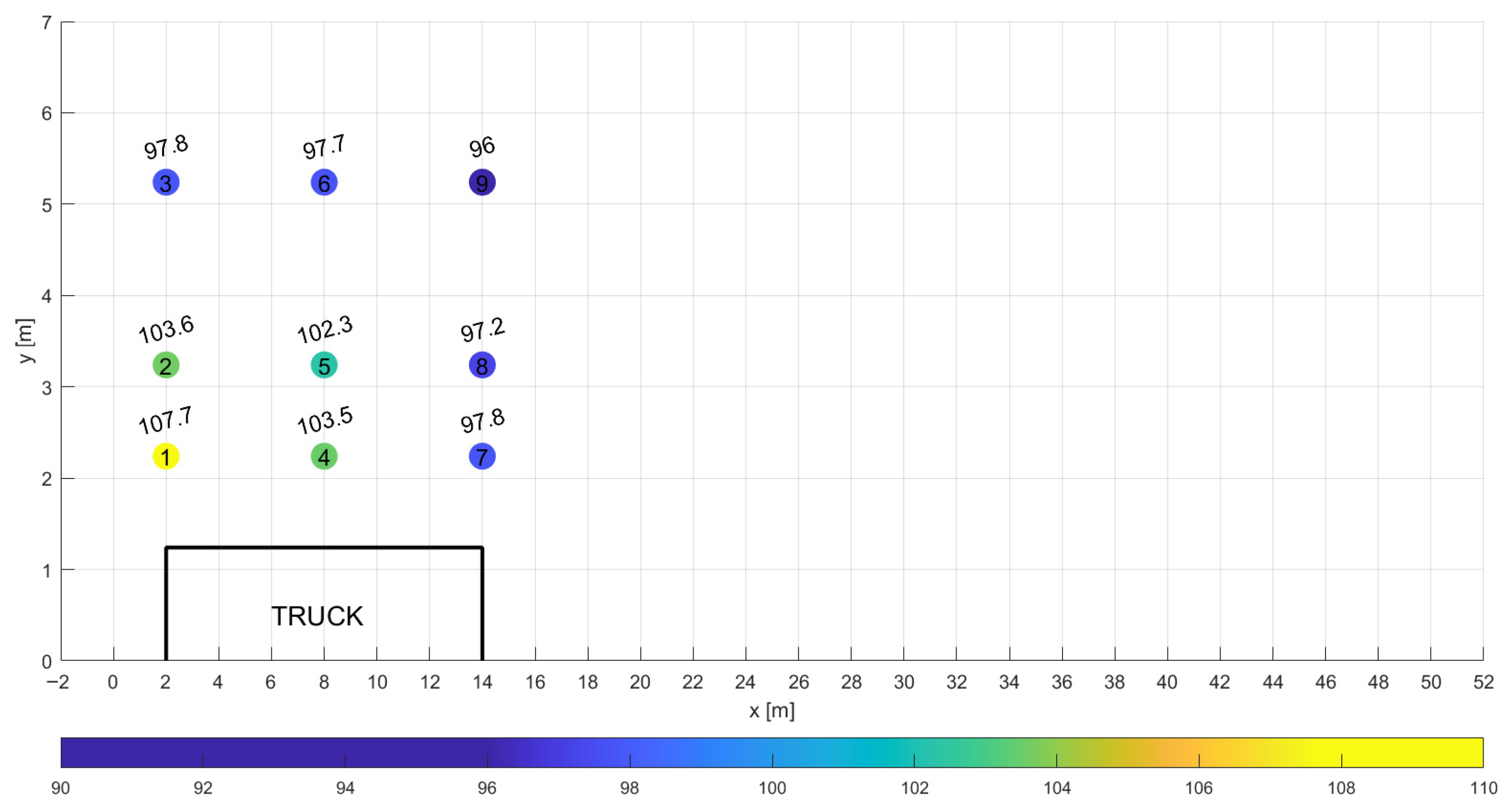 Figure 10), the highest A-weighted sound pressure levels were observed at points 1, 4, and 2, in the first and second cross-sections, while the lowest levels were recorded at points 9, 8, and 3, located in the third and first cross-sections. The maximum sound level was 107.9 dB at point 1, 1 m from the vehicle, and the minimum was 96.2 dB at point 9, 4 m from the truck. The largest difference in sound levels was found in cross-section 1 between points 2 and 3, amounting to 5.8 dB, whereas the smallest difference of 0.5 dB was between points 7 and 8 in cross-section 3. The most uniform distributions were 1.6 dB in cross-section 3, 6.0 dB in cross-section 2, and 10.3 dB in cross-section 1. The greatest non-uniformity in the analyzed area was 11.7 dB.
