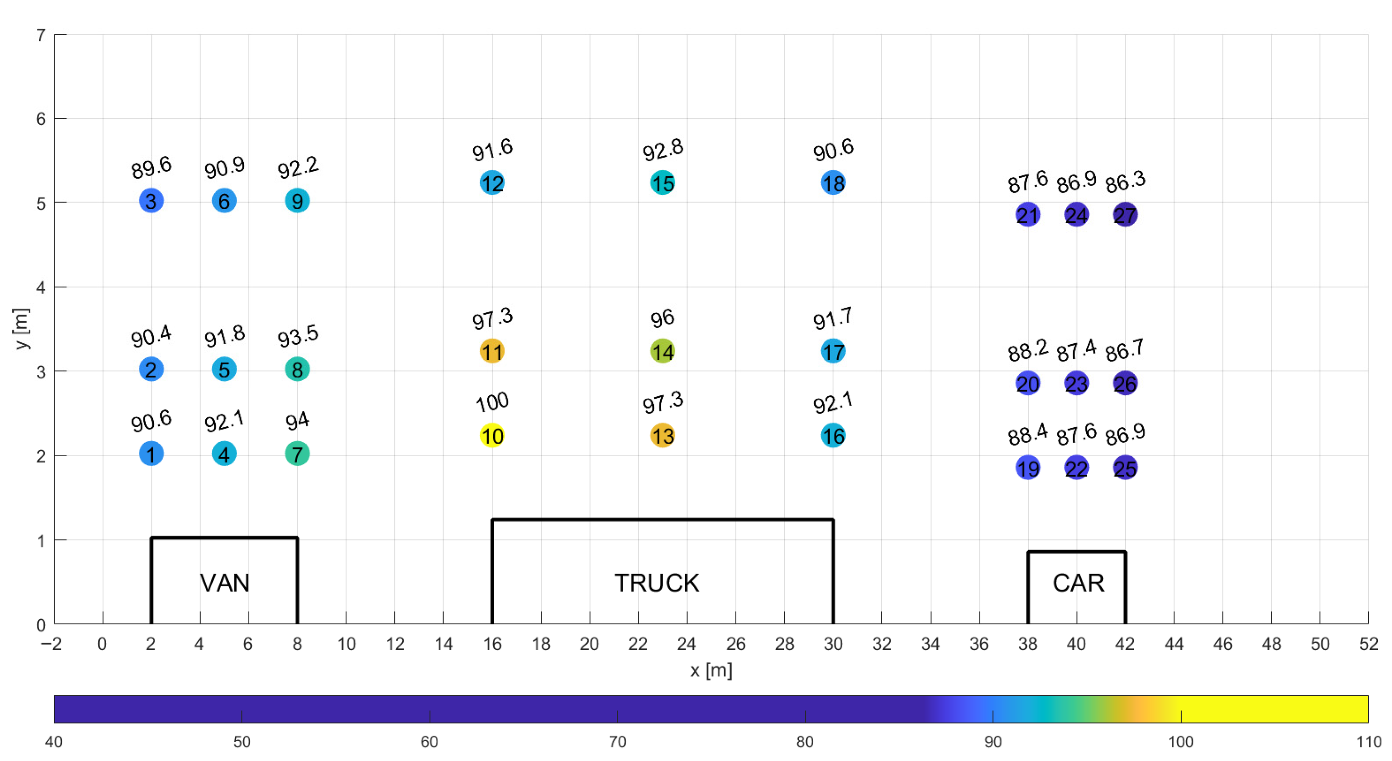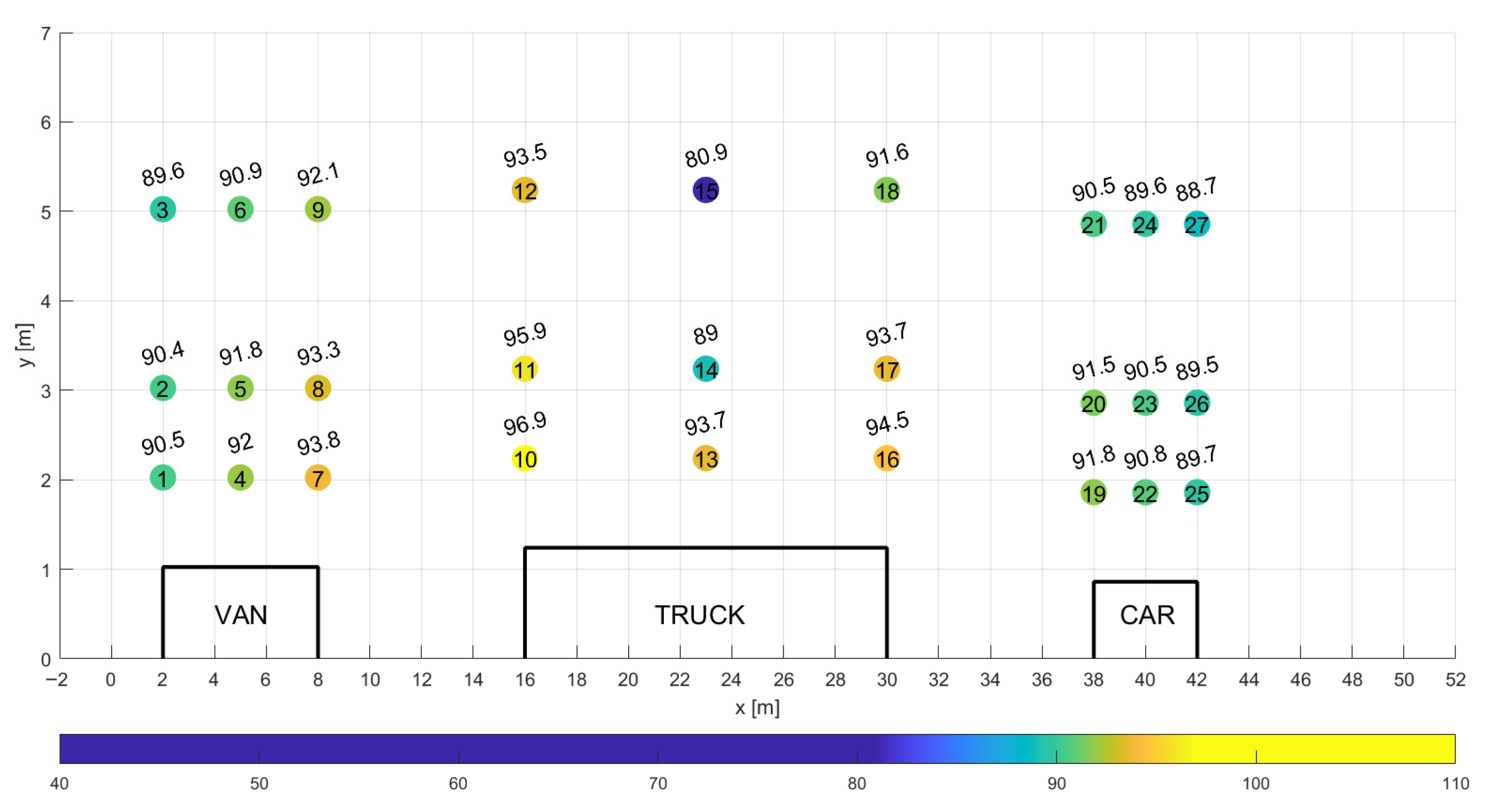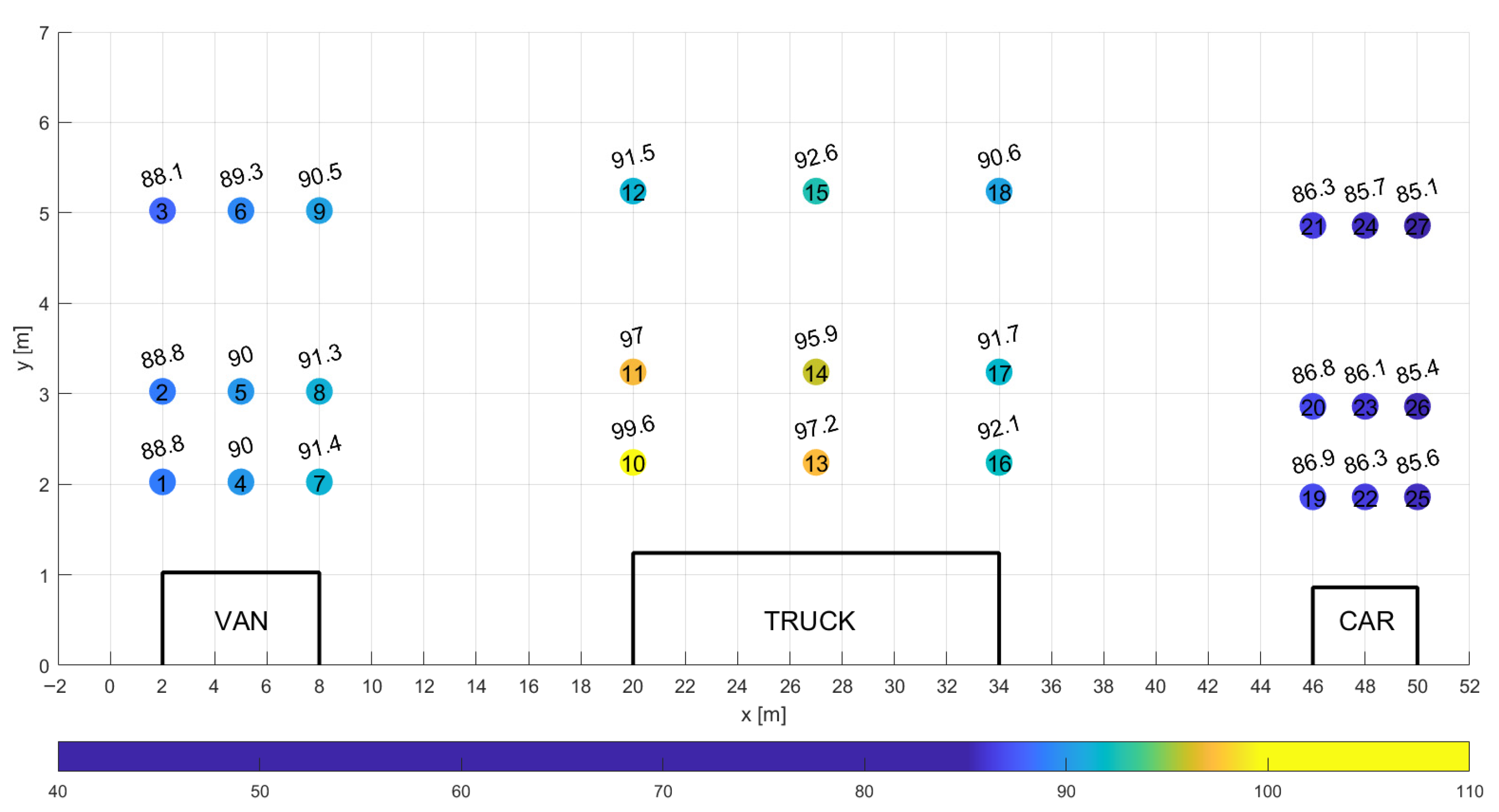 Figure 12) of A-weighted sound level distributions for a platoon moving at 50 km/h with a 4-m spacing, it was concluded that the highest sound pressure levels occurred at a distance of 1 m from the truck and the van—specifically at measurement points 10, 13, and 4. Conversely, the lowest A-weighted sound levels were recorded at a distance of 4 m from the passenger car—at points 27, 21, and 24. The maximum A-weighted sound level was 100.0 dB at point 10, located 1 m from the truck, while the minimum value was 88.7 dB at point 27, located 4 m from the passenger car. Furthermore, the greatest difference in A-weighted sound levels was observed in cross-section 8 between points 22 and 23, amounting to 6.7 dB, whereas the smallest difference—0.1 dB—was noted between points 17 and 16 in cross-section 6. The most uniform distributions of A-weighted sound level were observed as follows: 0.4 dB in section 6; 1.6 dB in section 5; 1.8 dB in section 2; 2.3 dB in section 3; 3.1 dB in section 7; 3.2 dB in section 1; 3.7 dB in section 9; 7.7 dB in section 4; and 7.8 dB in section 8. The maximum nonuniformity in A-weighted sound level between individual points within the analyzed area reached 11.3 dB.