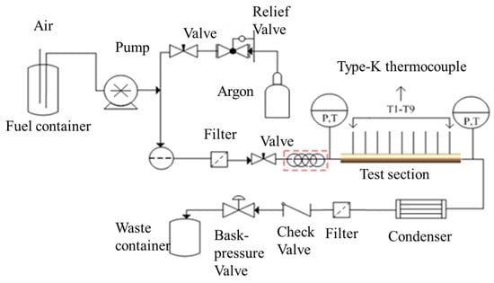 Pyrolytic and oxidative coking was performed in a near-isothermal flowing reactor, as shown in Figure 1, described by He et al. [37]. The flow reactor was primarily composed of a copper heat exchanger and a stainless-steel test section. This cylindrical exchanger, with a length of 500 mm and a diameter of 600 mm, enclosed a 500 mm-long stainless steel (SS316L) test tube, purchased from Beijing Xiongchuan Valve Manufacturing Co., Ltd. (Beijing, China), with an outer diameter of 3.175 mm and an inner diameter of 2.175 mm. Heating was provided by eight identical electrical cartridge heaters embedded within the copper block. For uniform thermal distribution, four heaters were arranged circumferentially at one end of the exchanger, and others were distributed in the same way at the other end. The wall temperature of the test section was measured using 9 type-K thermocouples, purchased from OMEGA Engineering (Shanghai) Co., Ltd. (Shanghai, China), at about 5 cm intervals along the tube. The uniformity of wall temperature can be controlled within 2 °C and the uncertainty of pressure is 2.5 kPa. A programmable preheater (red dotted box), Zhenjiang Chuxin Electric Heating Equipment Co., Ltd. (Zhenjiang, China), was installed in the front section of the reaction tube. When the preheating temperature reached the target temperature and stabilized for 10 min, the reaction section would be turned on to ensure the inlet temperature of the reaction section. Once the wall temperature of the reactor tube stabilized at the target temperature for 2 h, the saturated air fuel was introduced. After the liquid was discharged, the back-pressure valve reached the target pressure, and the test time began after stabilization.