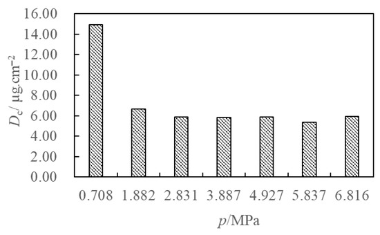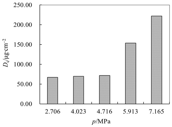 Figure 2 shows the oxidative coke amount of JP-10 at wall temperature of 623.15 K and pressures between 0.708 MPa and 6.816 MPa. Under these conditions, oxidative degradation of JP-10 yields relatively low coke deposits (5.37–14.95 μg/cm2). In the internal pressure from 2.831 MPa to 6.816 MPa, increases in pressure exhibit a negligible effect on the coke amount of JP-10 in the intermediate stage. This behavior is primarily attributed to the fact that JP-10 is an incompressible liquid over this pressure range. Accordingly, increases in pressure produce only minor changes in the Reynolds number, mass transfer characteristics, and residence time [18].