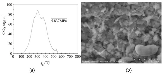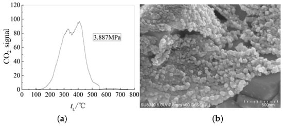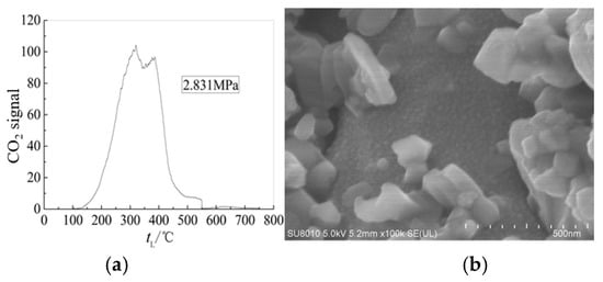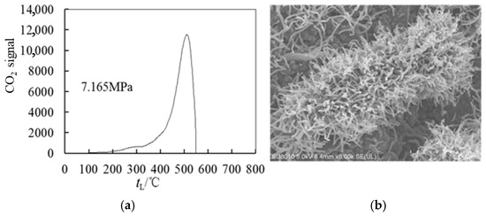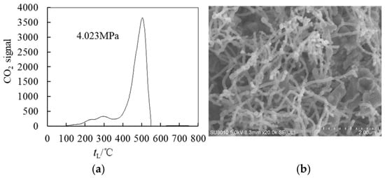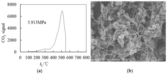 By comparing Figure 12b, Figure 13b, Figure 14b, Figure 15b and Figure 16b, it can be known that the fuel pressure has little effect on the morphologies of the pyrolytic coke of JP-10 in the temperature range of 2.706–7.165 Mpa. The pyrolytic cokes are carbon nanotubes across the investigated pressures, with one end of the carbon fiber connected to metal particles. They oxidized in the temperature around 500 °C, correlating with the high-temperature peak on the TPO profiles (Figure 12a, Figure 13a, Figure 14a, Figure 15a and Figure 16a). A small amount of amorphous carbon is also detected. The amorphous carbon oxidized at the temperature around 300 °C, corresponding to the low-temperature peak on the TPO profiles (Figure 12a, Figure 13a, Figure 14a, Figure 15a and Figure 16a).