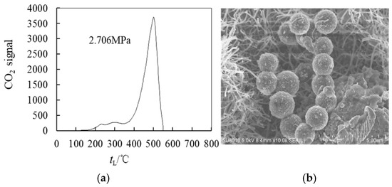 Figure 12, Figure 13, Figure 14, Figure 15 and Figure 16 show the TPO profiles and FESEM of the pyrolytic coke of JP-10 when the fuel pressure is 2.706 Mpa, 4.023 Mpa, 4.716 Mpa, 5.913 Mpa and 7.165 Mpa, respectively. Two CO2 emission peaks are given from Figure 12a, Figure 13a, Figure 14a, Figure 15a and Figure 16a: a low-temperature peak around 300 °C, attributed to the oxidation of amorphous carbon with high reactivity, and a high-temperature peak around 500 °C, associated with the oxidation of more ordered carbon structures. No additional CO2 emission peaks were found above 500 °C. It can be seen from Figure 12b, Figure 13b, Figure 14b, Figure 15b and Figure 16b that the pyrolytic coke of JP-10 is mainly carbon nanotubes, with a small amount of granular carbon particulates. Similar tubular morphologies have been widely reported in previous studies of JP-10 [41], supporting the identification as carbon nanotubes. The carbon nanotubes are caused by pyrolysis of JP-10 because the experimental temperature is above the pyrolysis temperature of JP-10. No sulfur signal is detected in the EDS spectrum (Figure 17), which also proves that the coke deposits are carbon nanotubes rather than metal sulfide.