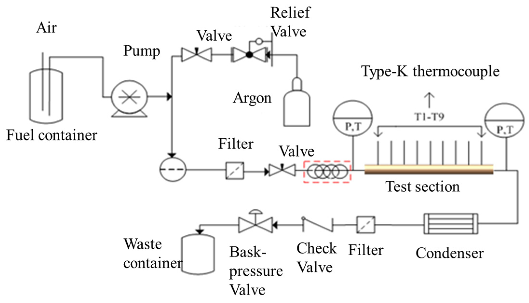 - Huang, X.; Liu, C.; Yang, F. Experimental study on flow heat transfer and thermal cracking coking of high-density hydrocarbon fuel JP-10. CIESC J. 2024, 75, 2917–2928. [Google Scholar] [CrossRef]