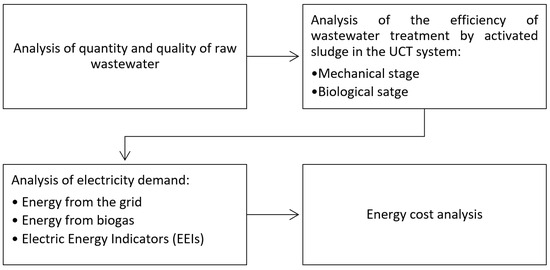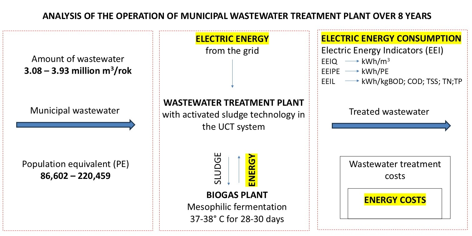 Figure 1 presents experimental design of this study, which analyzed the operation of a municipal WWTP over the period of 2015–2022. The research included the assessment of influent and effluent quantity and quality, the evaluation of electricity consumption using EEIs, and the analysis of treatment costs based on operational data provided by the WWTP operator. The facility, located in central Poland, employs an activated sludge treatment system configured as a UCT process. It receives wastewater from municipal collectors as well as septage delivered by vacuum trucks to a designated receiving station. This septage originates from sealed tanks and septic systems associated with domestic wastewater treatment plants. In addition to municipal wastewater, the WWTP also accepts industrial wastewater, and to some extent, stormwater and snowmelt from a combined sewerage system as well as infiltration from the sanitary sewerage network. The treated effluent is discharged into a river. The actual PE during the analyzed period ranged from 220,459 to 86,602, and the flow of treated wastewater ranged from 3,930,268 to 3,083,863 m3/year (the table in Section 3.1). All wastewater treatment processes are automated and monitored through a Supervisory Control and Data Acquisition (SCADA) system. Any operational disturbances are visualized in the Main Control Room and the Thermal Sludge Utilization Plant Control Room, ensuring continuous supervision and immediate response to irregularities. A simplified technological scheme with marked sampling points is presented in Figure S1. The total installed power of the treatment system amounts to 767.05 kW (216.05 kW for the mechanical treatment stage and 551.00 kW for the biological treatment stage).