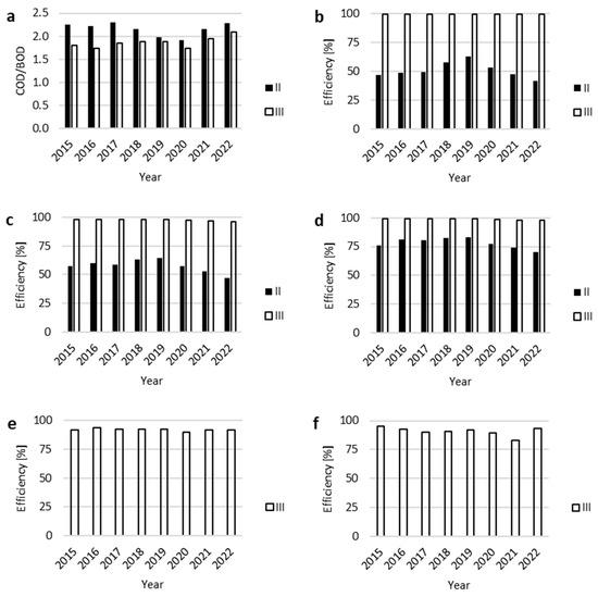 COD/BOD ratio (a) and pollutant removal efficiencies of BOD (b), COD (c), TSS (d), TN (e), and TP (f) after mechanical (II) and biological (III) treatment compared to raw wastewater.