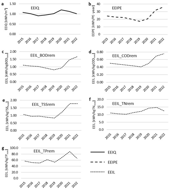 Changes in EEIs over the study period: EEIQ (a); EEIPE (b); and EEIL for BOD (c), for COD (d), for TSS (e), for TN (f), and for TP (g).