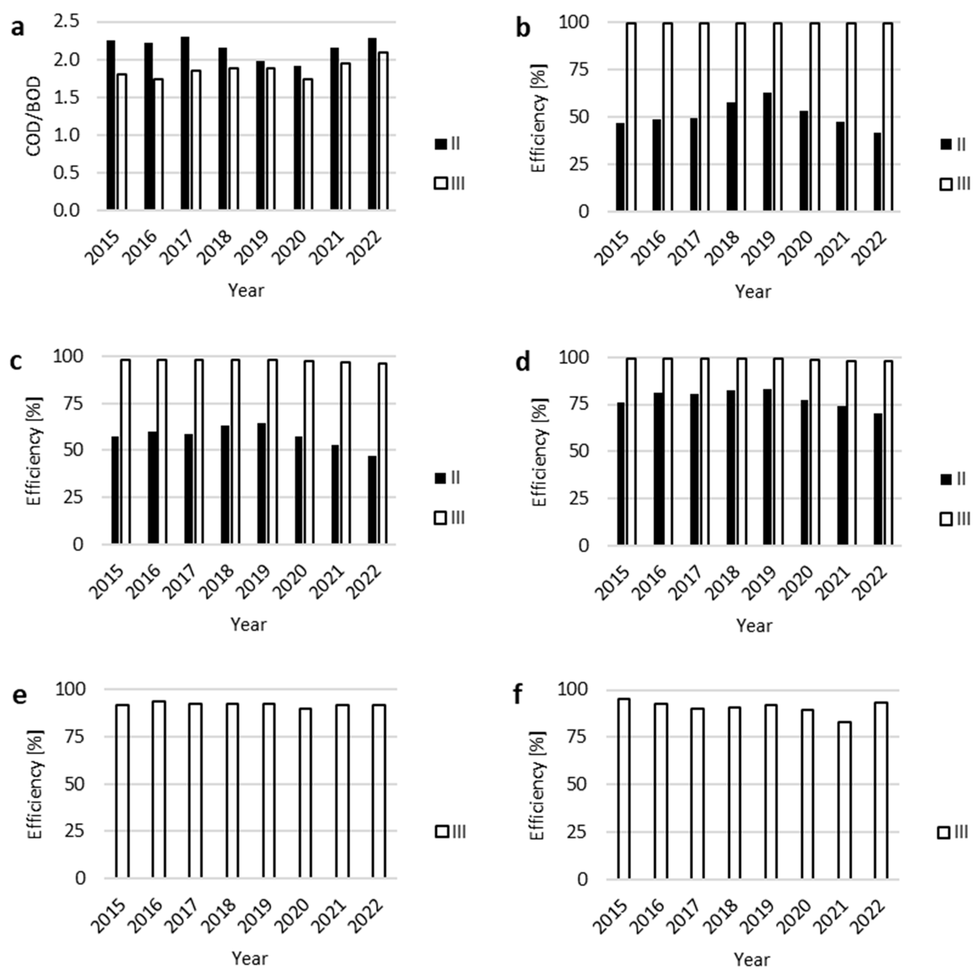 - Nowobilska-Majewska, E.; Bugajski, P. The Analysis of the Amount of Pollutants in Wastewater after Mechanical Treatment in the Aspect of Their Susceptibility to Biodegradation in the Treatment Plant in Nowy Targ. J. Ecol. Eng. 2019, 20, 135–143. [Google Scholar] [CrossRef]