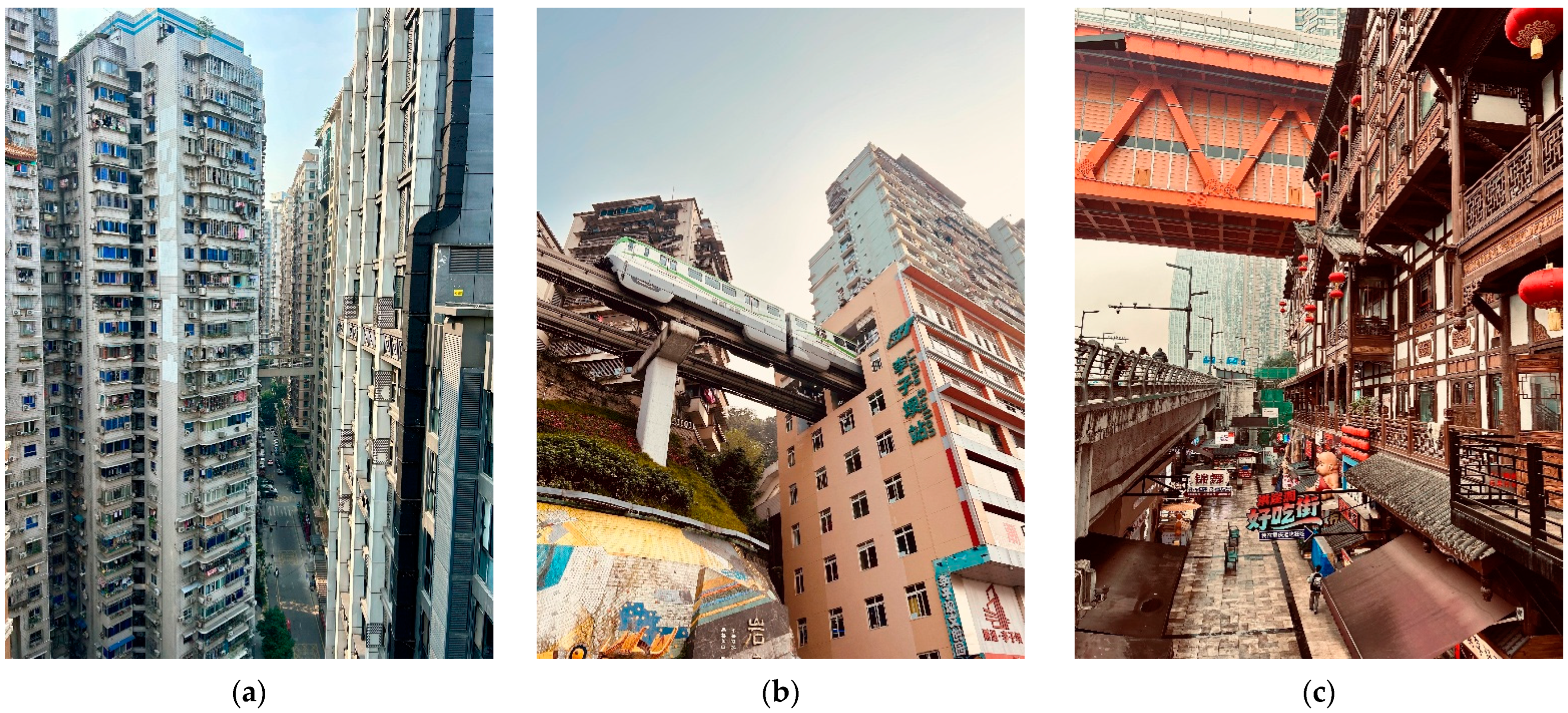 - Roast, A. Towards weird verticality: The spectacle of vertical spaces in Chongqing. Urban Stud. 2024, 61, 636–653. [Google Scholar] [CrossRef]