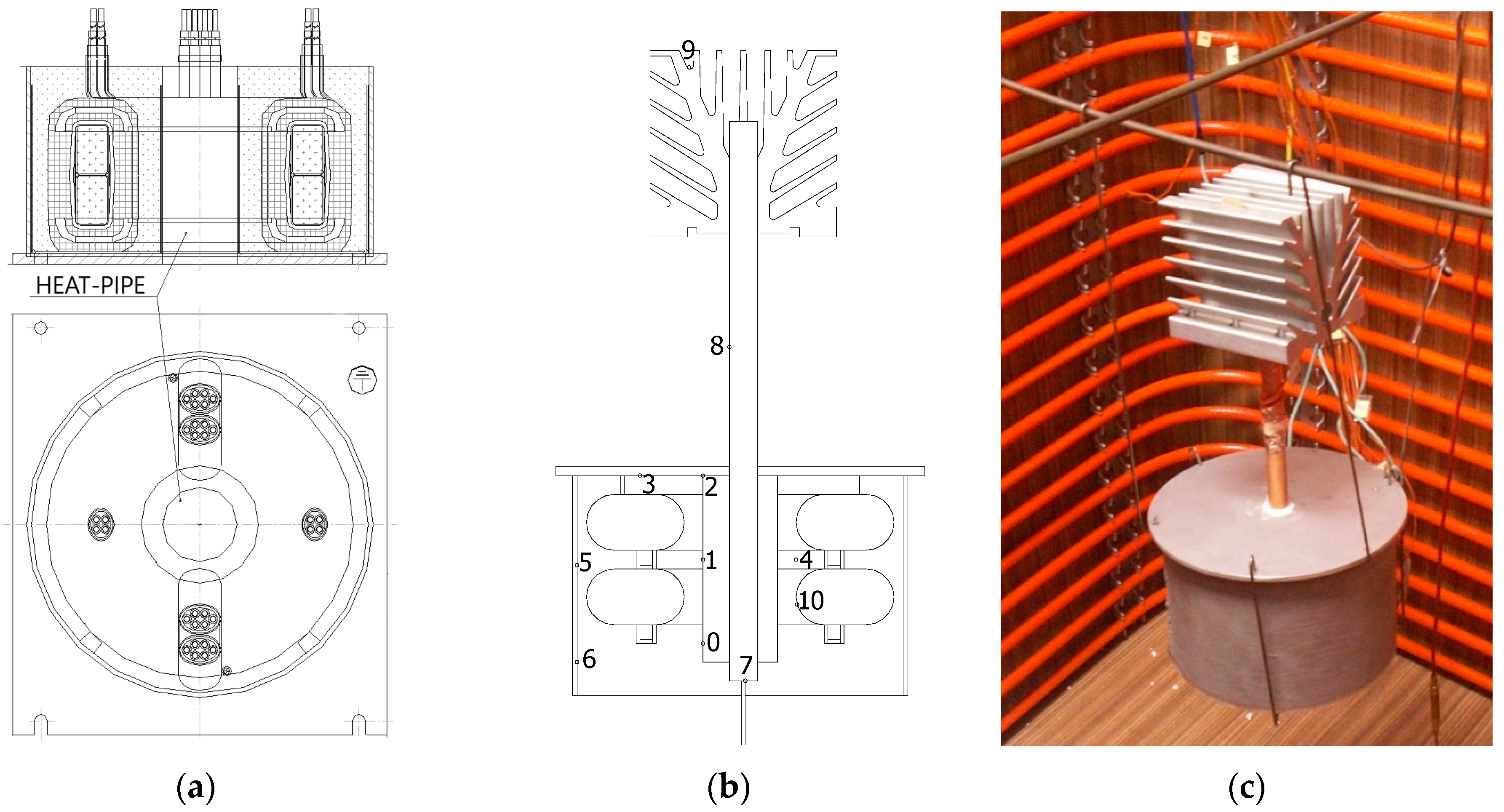 Design of energy converter transformer and measurement model with a heat pipe. (a) shows a cross-section through a static converter, (b) shows the location of the measuring points (thermocouples) when cooling with a finned heat pipe, (c) a realistic device placed in a measuring thermostatic chamber.