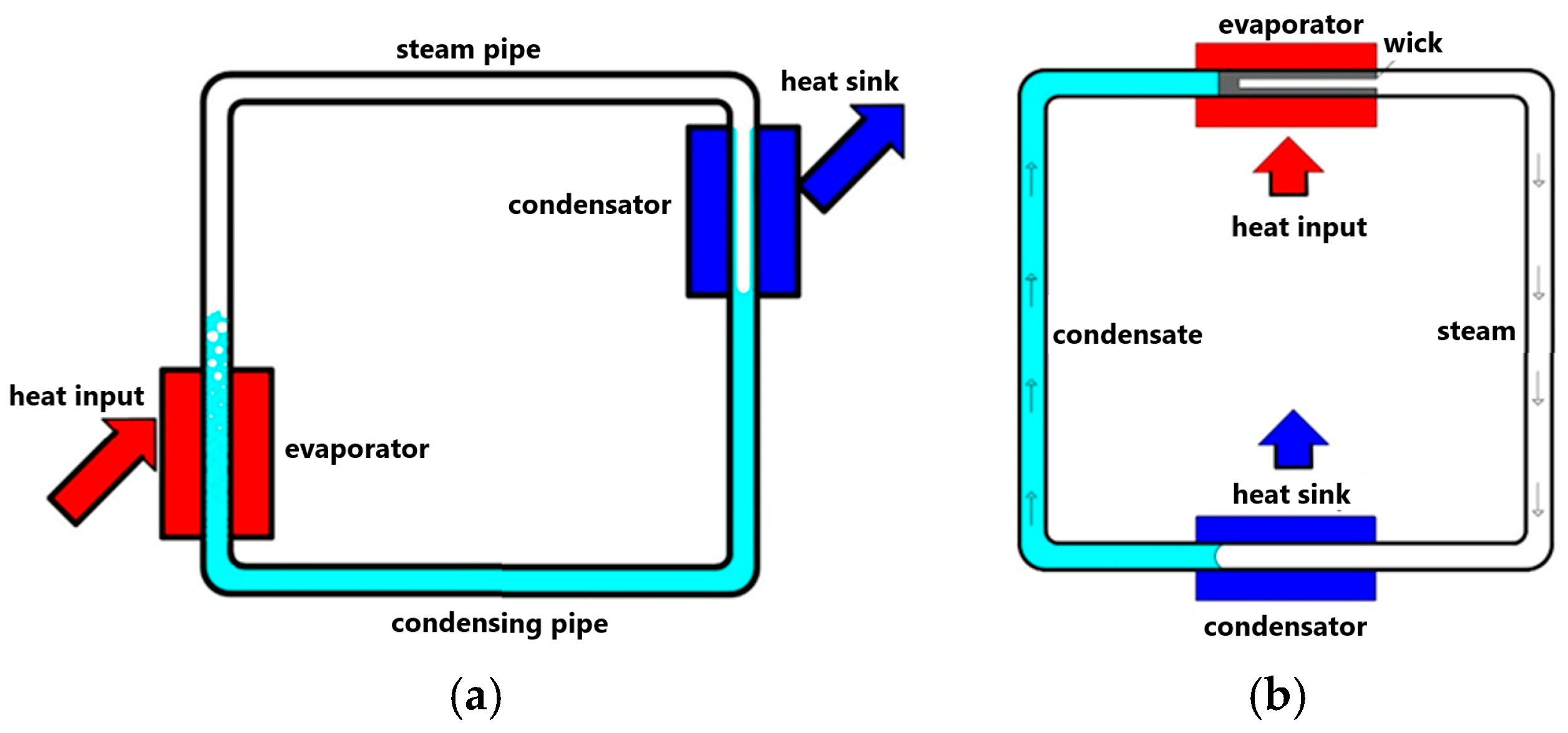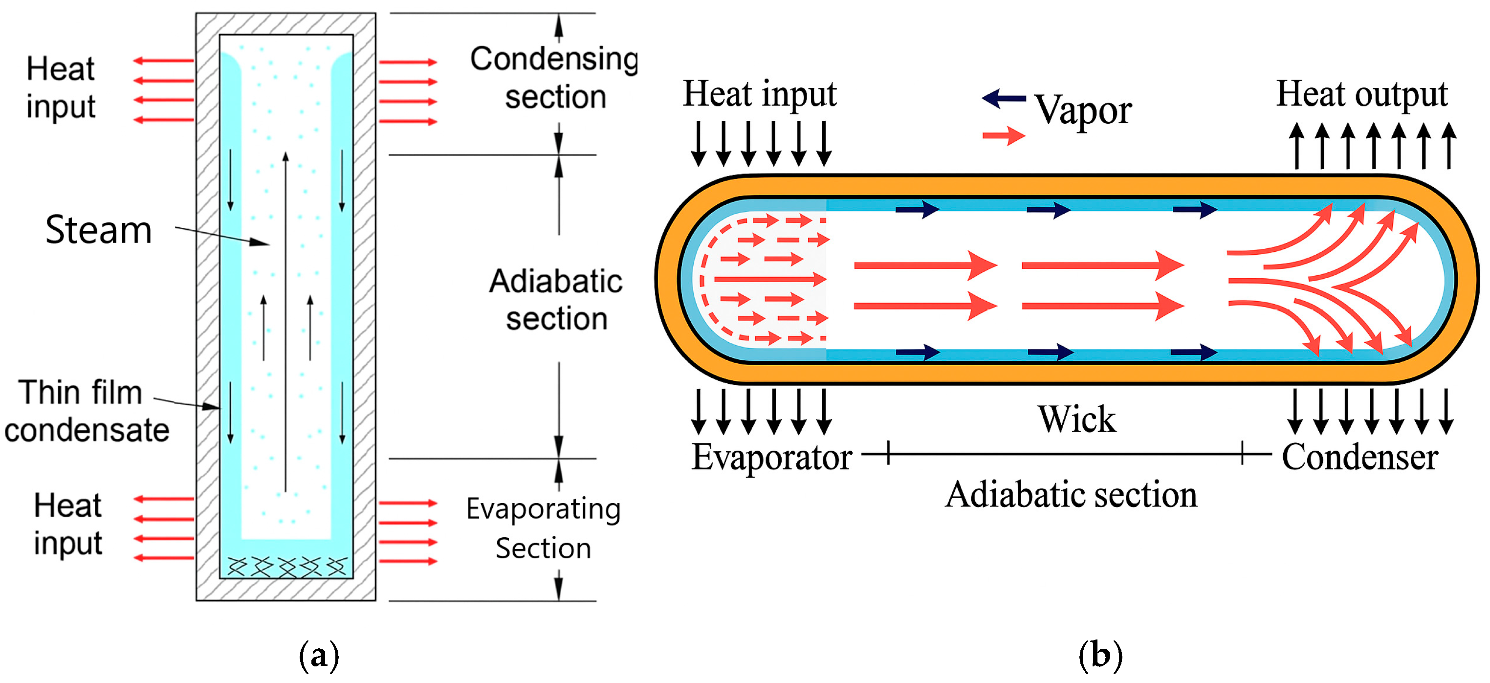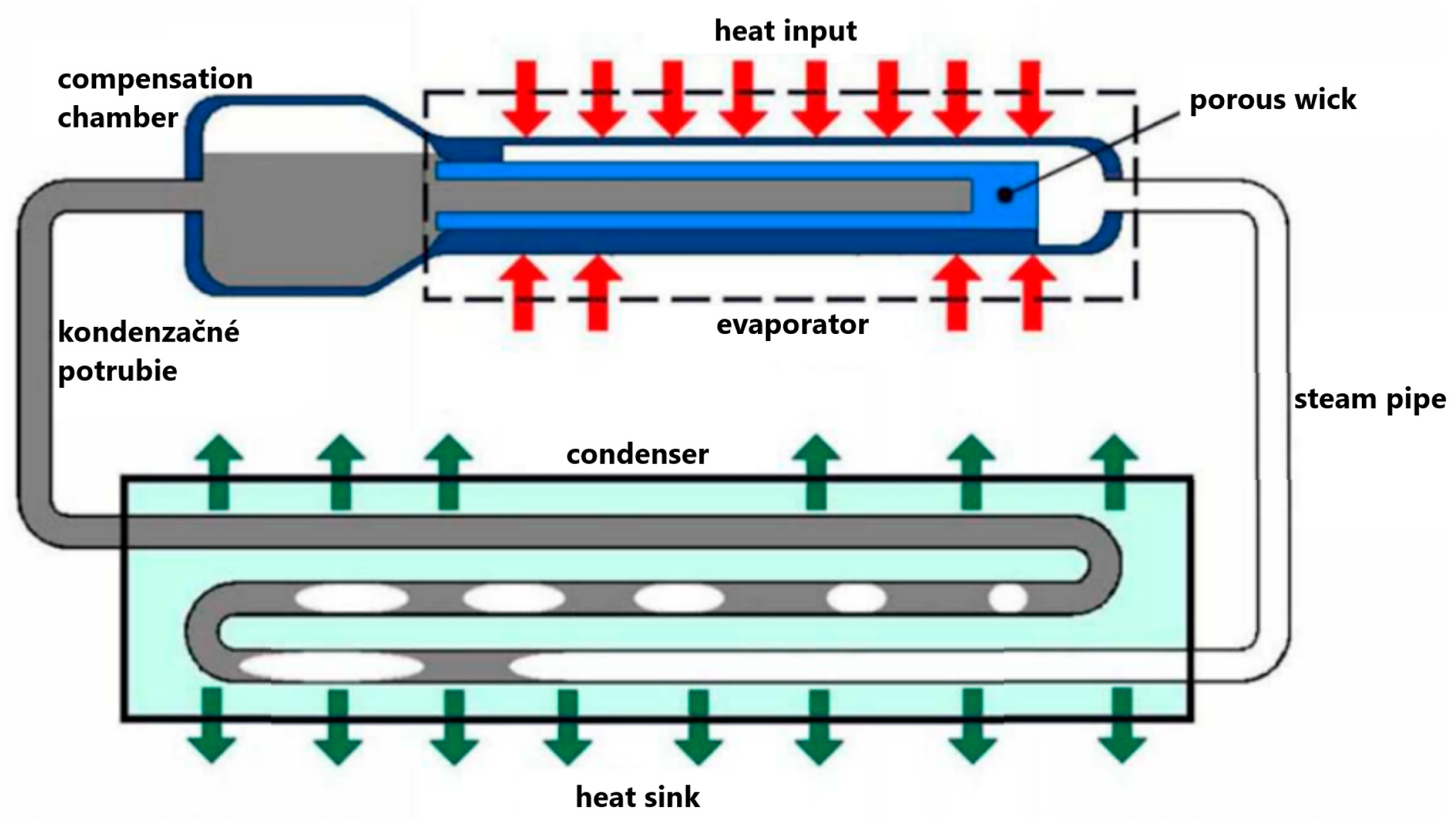 Figure 3a,b) is a device used to transfer heat by phase transformation and with a high heat flux density. It contains a working medium (alcohol, water, mercury, ammonia, helium, Freon…) in two phases at a certain pressure dependent on temperature. By heating one end of the tube and cooling the other, the medium is circulated so that at the heated end the medium evaporates and the vapour moves to the cool end where it condenses back to a liquid and, by spontaneous fall or rise through the capillary structure, the liquid again reaches the warm end, where the process repeats itself again. This creates a forced circulation of the working substance associated with heat transfer [