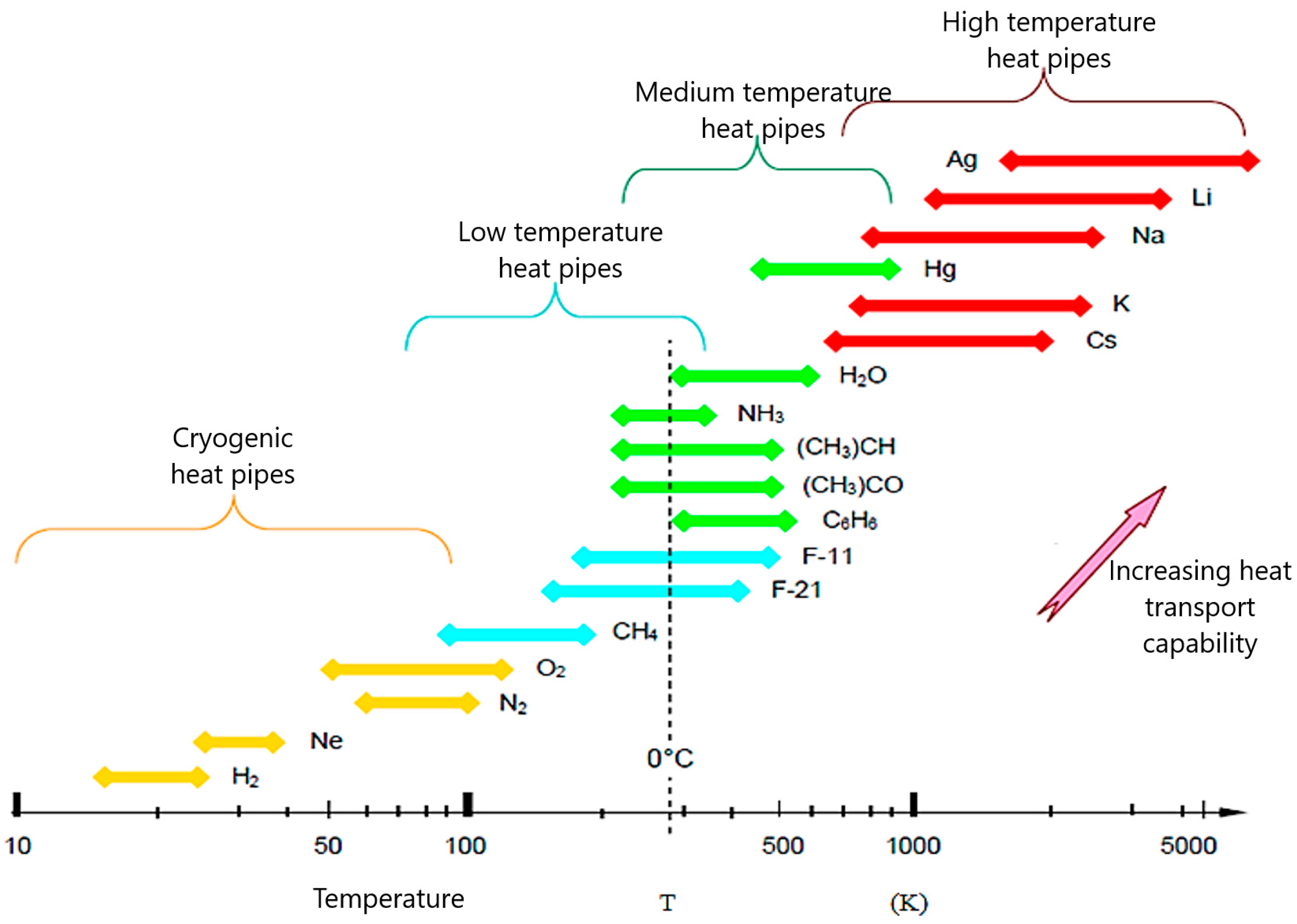 The selection of the working medium depends on the temperature range of the tube, the required evaporation and condensing temperatures, the pressure inside the tube, and the ambient pressure. An overview of some frequently used working fluids is given in