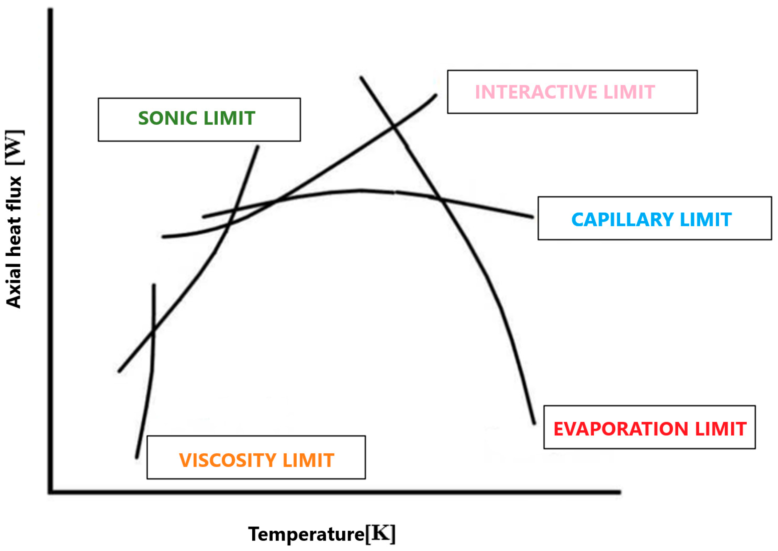 Figure 5) refer to phenomena in the heat pipe that reduce the amount of power transferred through the heat pipe. These limits depend on the choice of working substance, capillary structure, material, dimensions, and operating temperatures. For the operation of the heat pipe, the delivered heat input plays the most important role, on which the mass flow of the working substance in the pipe depends.