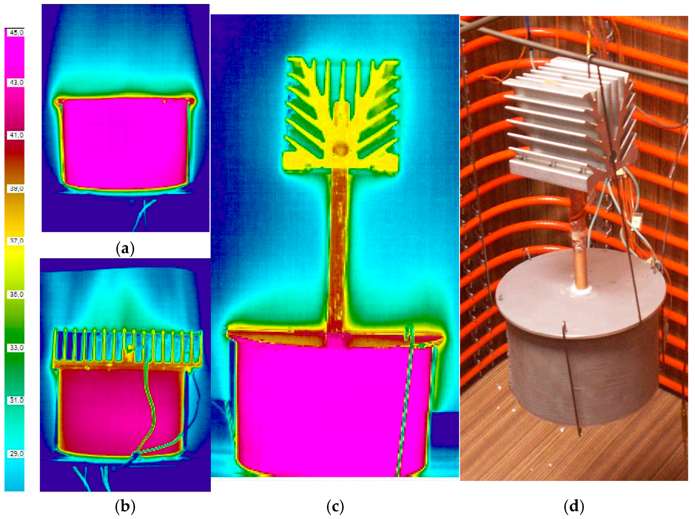 Thermographic (°C) images of the transformer in the case under natural cooling. (a) Case without finned heat sink, (b) with finned heat sink, (c) with gravity heat pipe and finned heat sink, (d) a realistic device placed in a measuring thermostatic chamber.