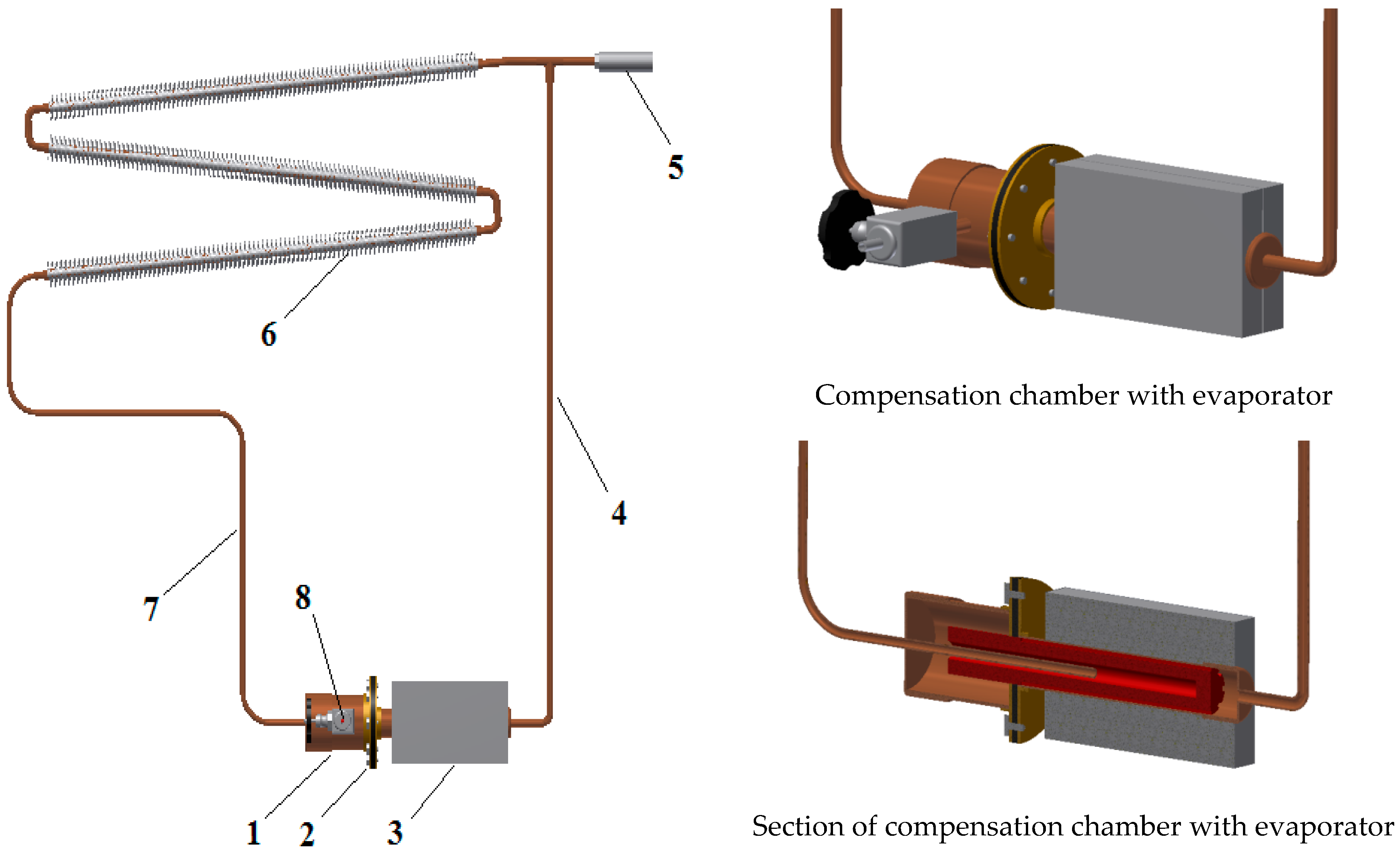 Ribbed LHP with air-cooled condenser: 1—compensation chamber, 2—flange, 3—evaporator with aluminium block, 4—steam pipe, 5—pressure gauge, 6—condenser, 7—liquid pipe, 8—filling valve.