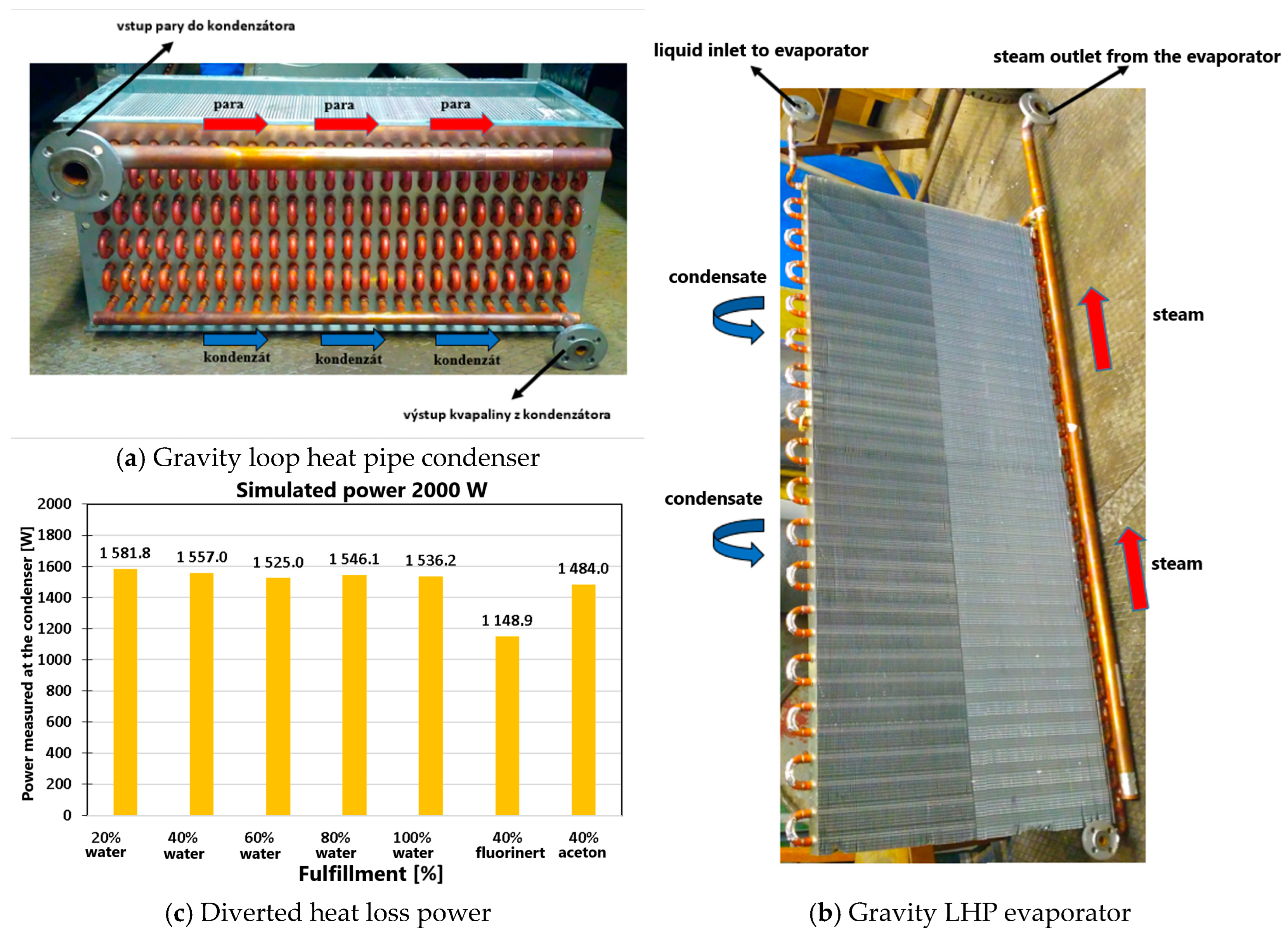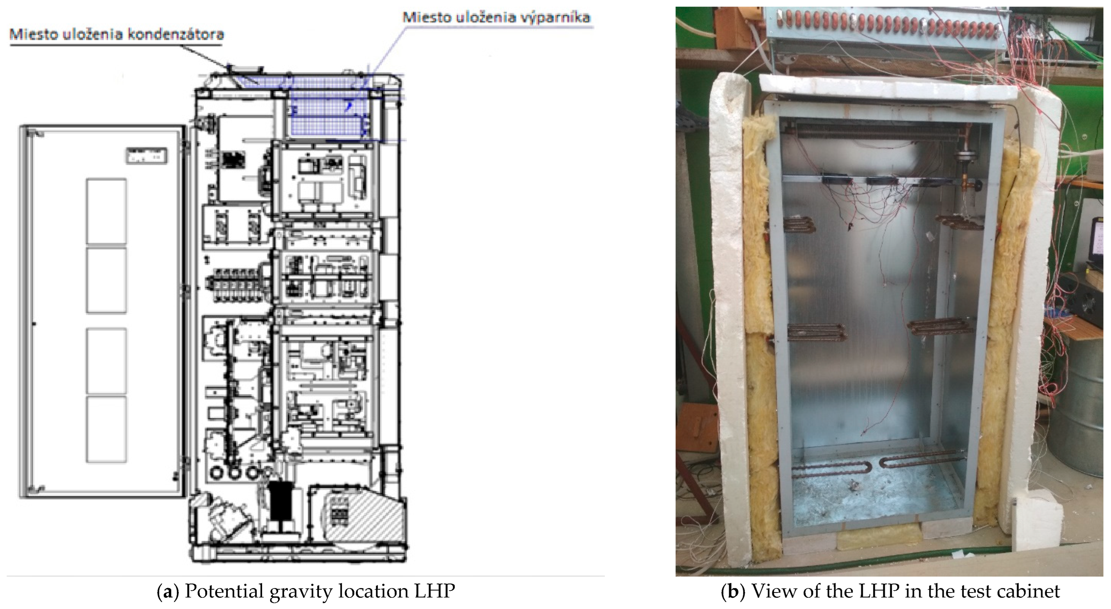 11]. It is a power electronic device with no moving parts that converts electrical energy parameters of one kind (magnitude and time history of voltage and current, frequency, and number of phases) into other desired parameters. The heat pipe has also proved to be quite a promising device for the dissipation of stray heat in this case. A very important advantage of using a heat pipe cooling device is the possible dust-tight sealing of the electronic equipment and thus the prevention of contamination of the electronic components by the deposition of dust from the cooling ventilation system. The electrical cabinet was hermetically sealed with sheet metal parts without ventilation grilles. The heat loss was dissipated by forced convection heat transfer from the flowing air to the evaporator of the gravity straw tube inside the enclosure. The steam and condensate flowed between the evaporator and condenser through two tubes of corresponding diameters, which had a dust-tight passage in the wall. The finned condenser was cooled outside the interior of the cabinet by natural or forced convection. The HP LOOP charge was water, acetone, and Fluorinert 72 (3M—Czech republic, Praha,
