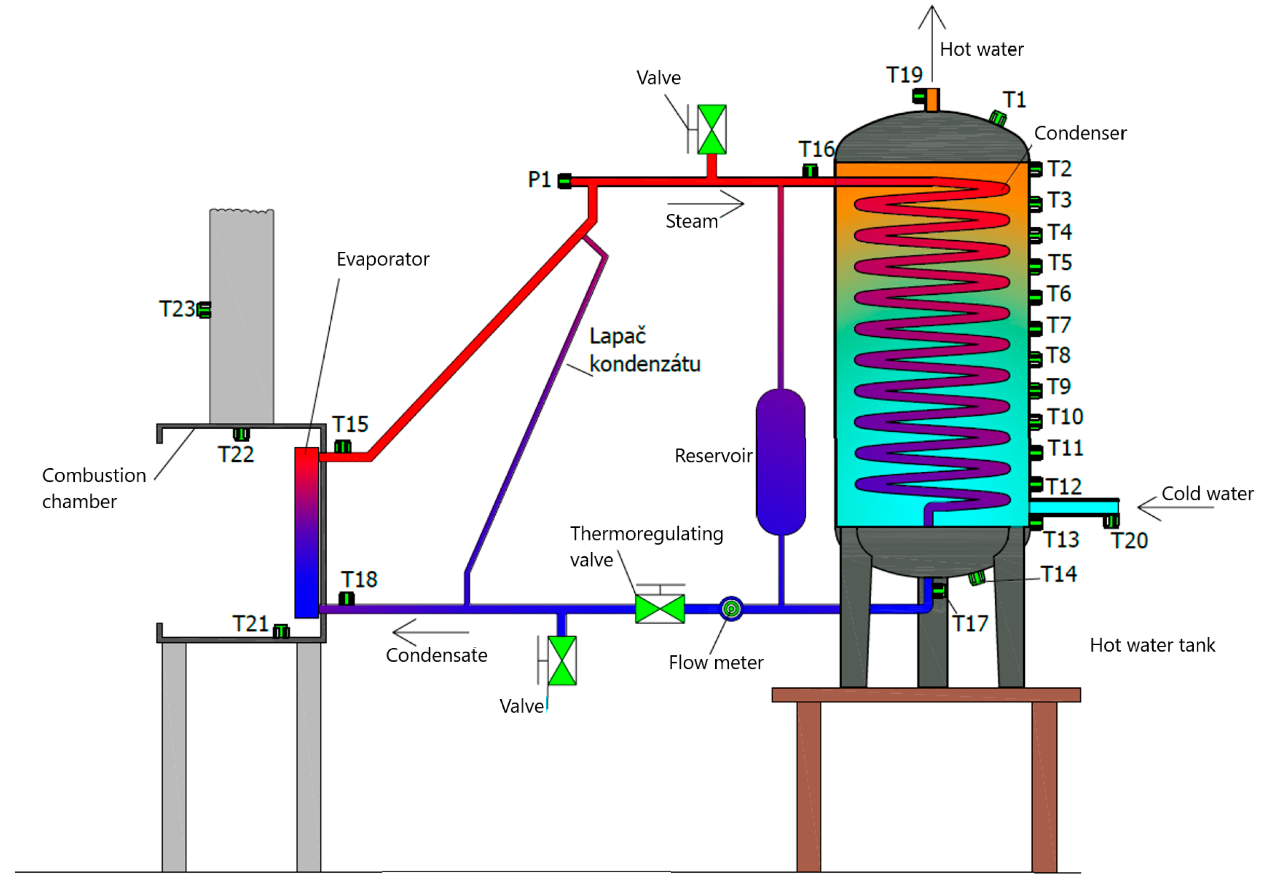 19]. By removing some of the otherwise unused heat from the flue gas, we have the opportunity to reduce the largest heat loss, and by using this heat we can also increase the efficiency of the FGD by removing some of the heat from the flue gas and then using it to preheat the combustion air using a loop thermosyphon (LHP). The proposed device for increasing the thermal efficiency of the MZT consists of a loop heat pipe (LHP), the evaporative part, which is located before the inlet to the chimney, where it removes part of the heat from the flue gas and through the steam pipe of the LHP the heat is transported in the form of steam to the condensing part of the LHP located in the combustion air inlet duct. After the heat has been transferred to the combustion air, the condensate is transported by gravity through the condensing duct back to the evaporator, where it is again converted to steam and the cycle is repeated.