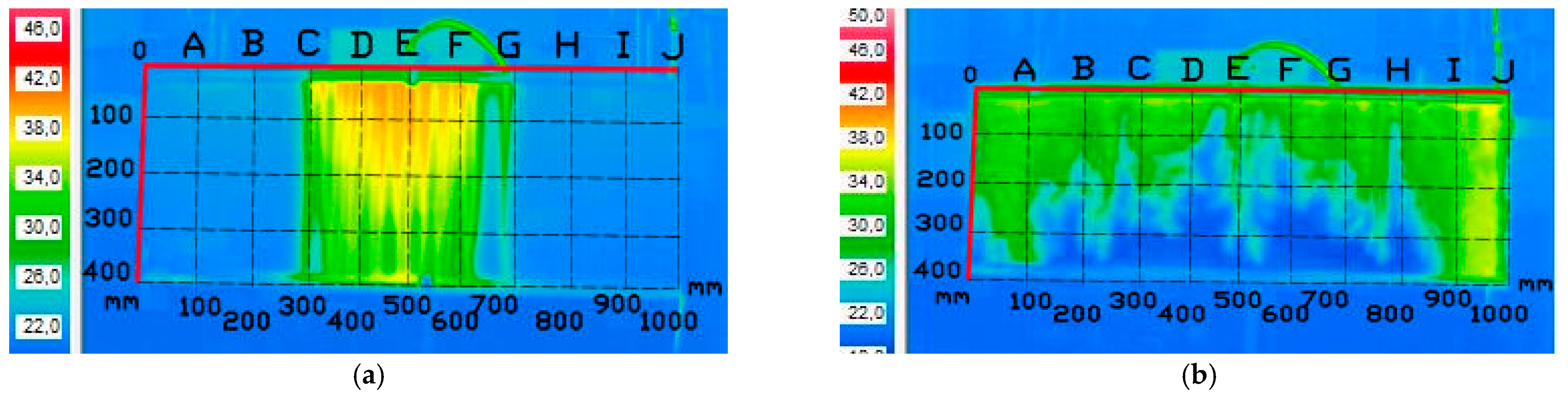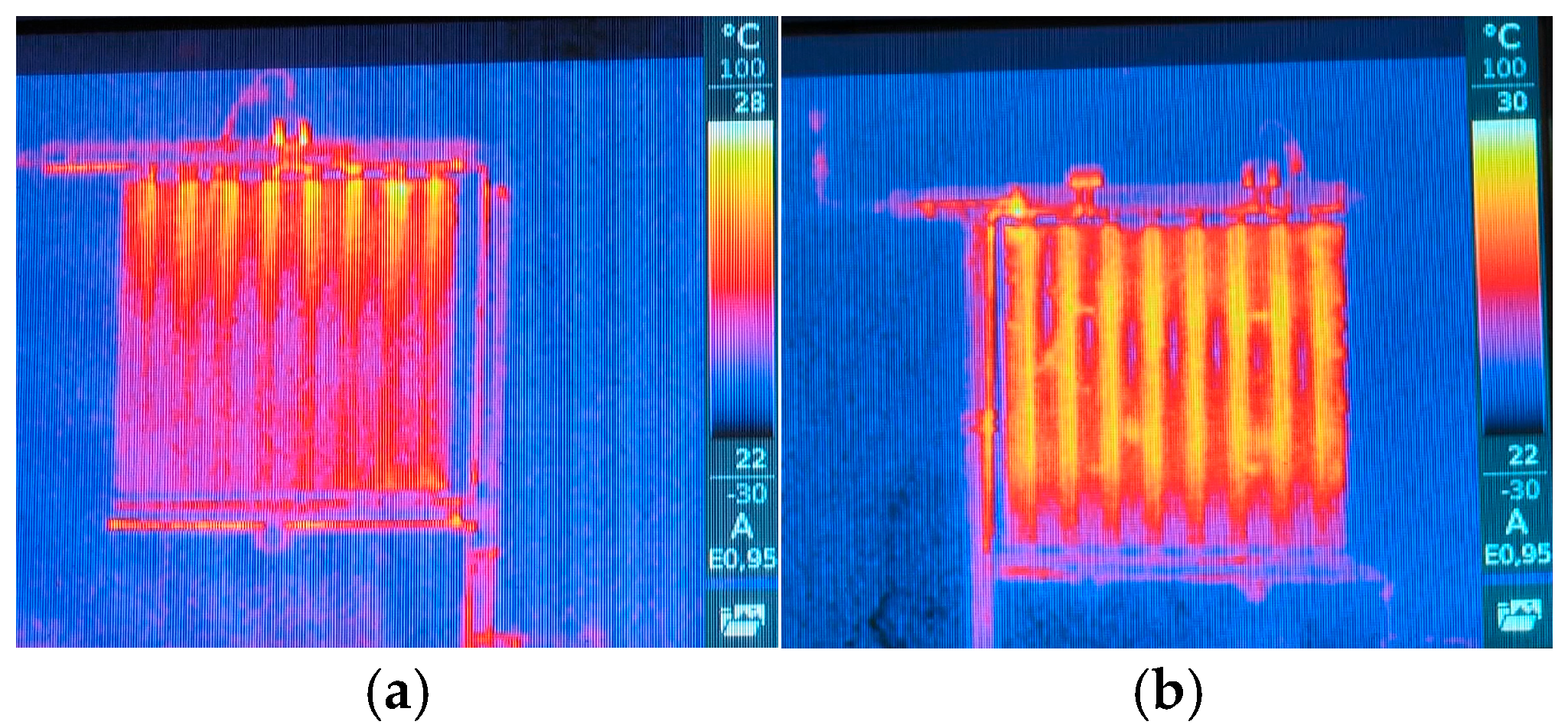 Thermographic images of the evaporator wall with the distribution of water condensate at a temperature of approx. 40 °C fed into the centre of the condensate distribution pipe. (a) Original condensate distribution through the pipe with holes Φ = 1 mm with uniform spacing of 50 mm. (b) Adjusted distribution with uneven spacing of holes in the condensate distribution.