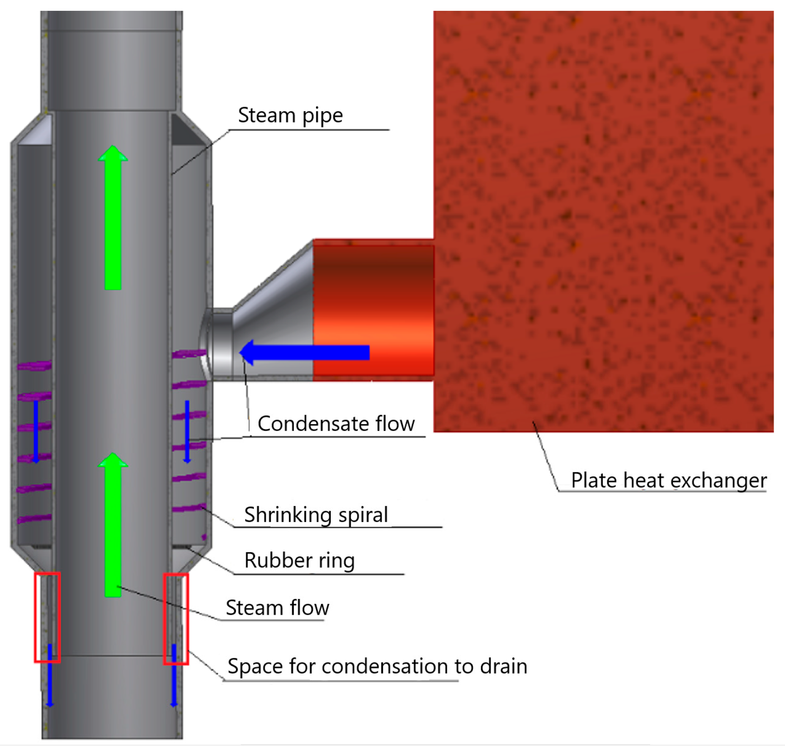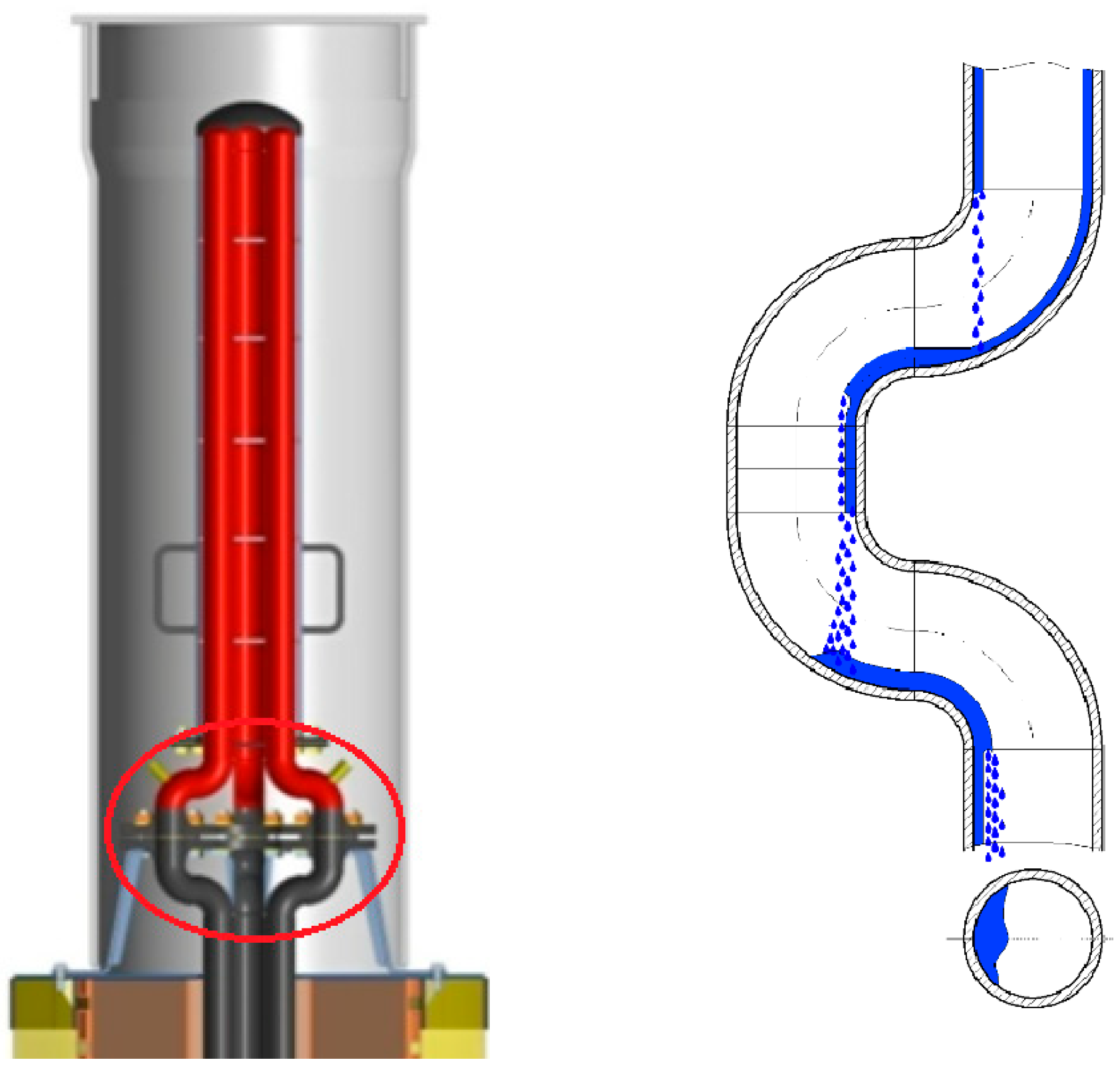 Initial experiments showed that the cardinal problem of the large-scale evaporator is to optimise the bypass of the evaporator wall by condensate in a closed-loop gravity heat pipe. Therefore, it was necessary to design the condensate distribution system such that the liquid fed to the wall flows around the entire vertical surface of the evaporator uniformly.