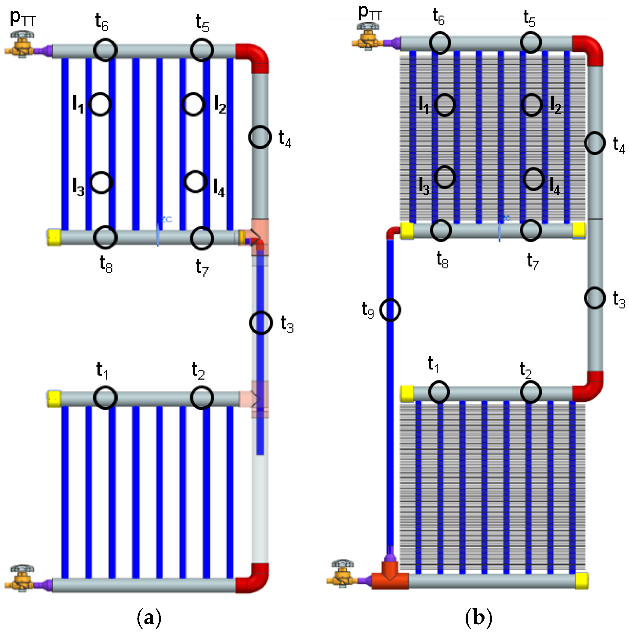 Location of the temperature and pressure sensors on the heat pipe for the condenser heating dynamics measurements on the original design (a) and the modified design (b). t—is the marking of measuring points with thermocouples.