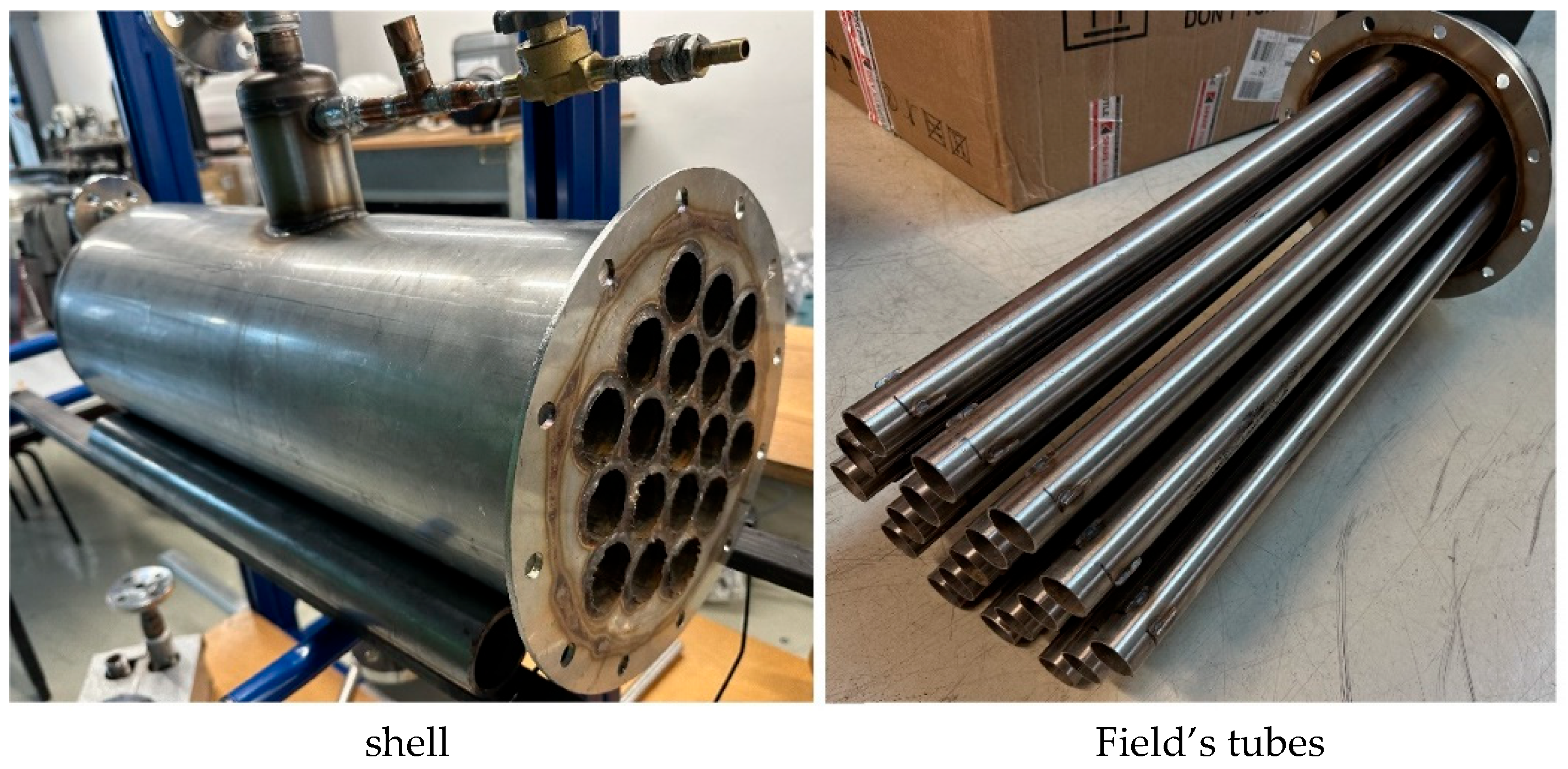 12]. Also, in this case, it is possible to use the properties of the gravitational loop tube—thermosiphon loop. In order to extract the heat from the fireplace insert, transfer it, and then use it to heat the water in the storage tank, a system of heat exchangers was designed (