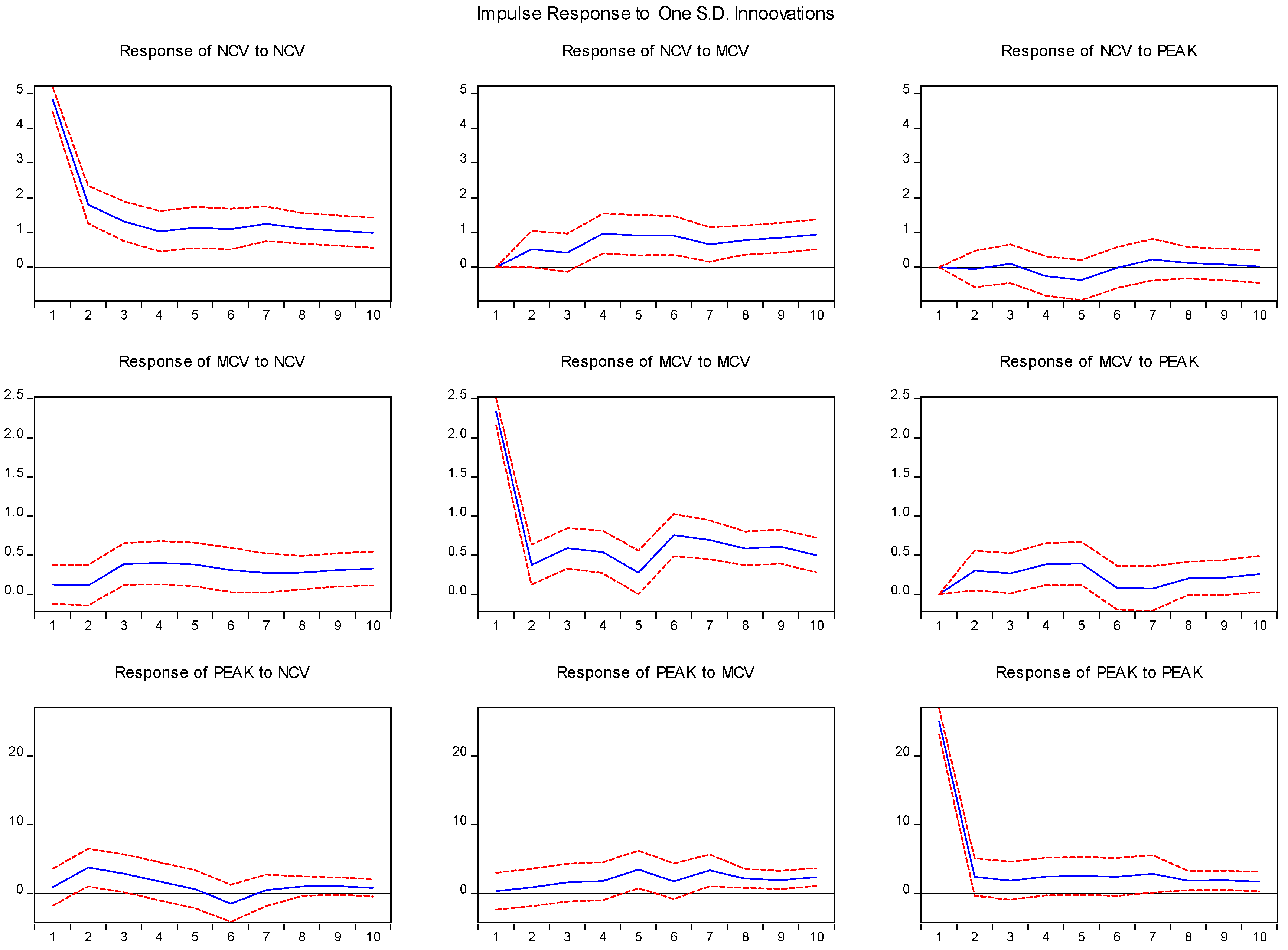 - To validate whether the proposed EV charging strategy contributes to peak shaving and valley filling, we first employ a Vector Autoregression (VAR) model. The charging volume data are divided into three temporal groups: the combined charging volume from 22:00 to 24:00 and 0:00–8:00 (NCV); the charging volume during 11:00–13:00 (MCV); and the charging volume during all other time periods (PEAK). (To simplify the model, we consolidate the charging volumes from non-renewable energy dominant periods—which also correspond to time intervals without the lowest electricity prices—into a single variable labeled PEAK). These groupings serve as key variables in the VAR analysis to assess dynamic interactions and grid load-shifting effects. If mutual influences exist among these variables, it would justify the comparative analysis of EV peak shaving and valley filling efficiency.