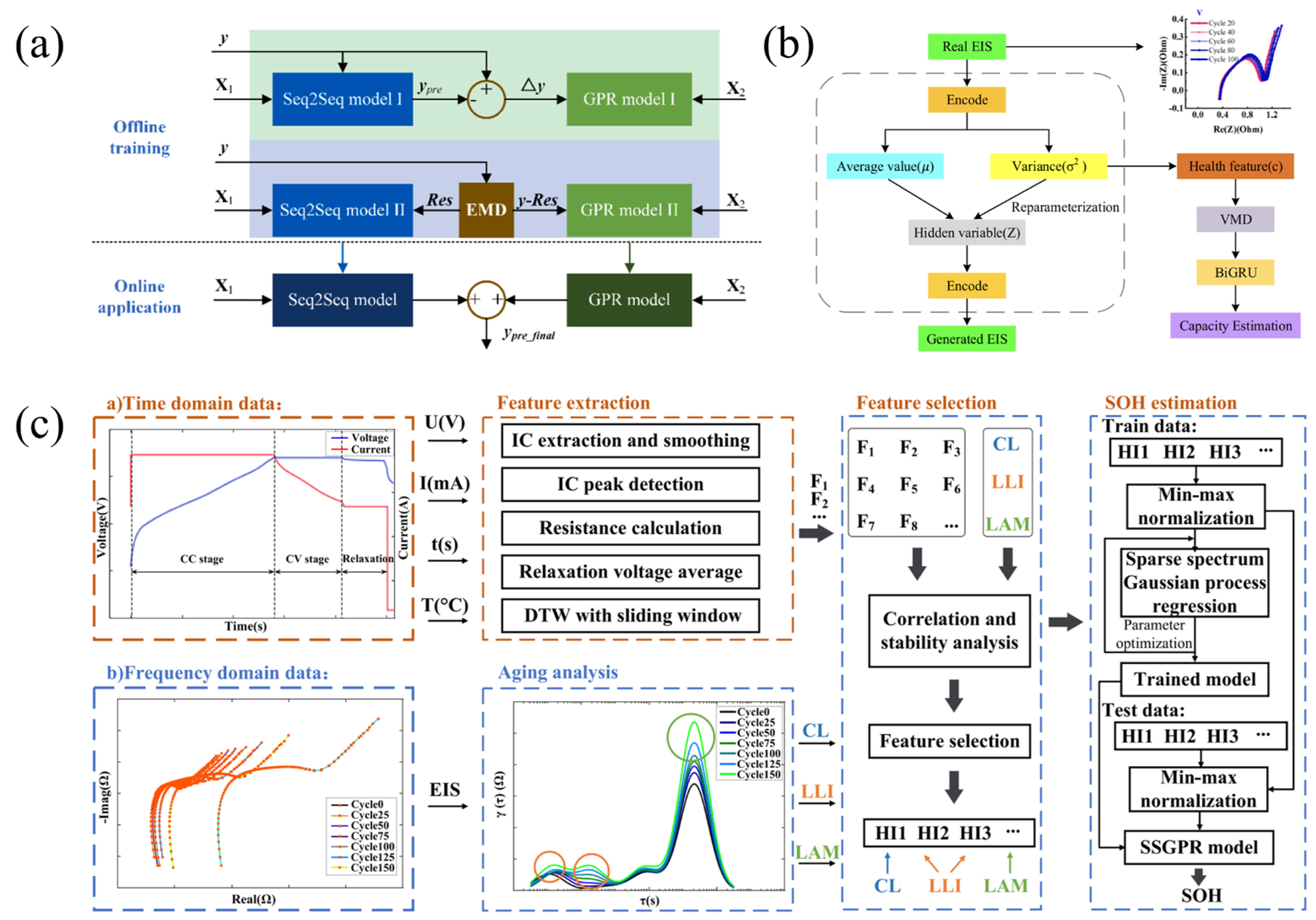 Third | Dual time-scale state-coupled co-estimation [13], Physics-informed neural network [98] | Cycling test, EIS test, and random real-world electric vehicle data | NCA and NCM battery datasets with EIS [77] |