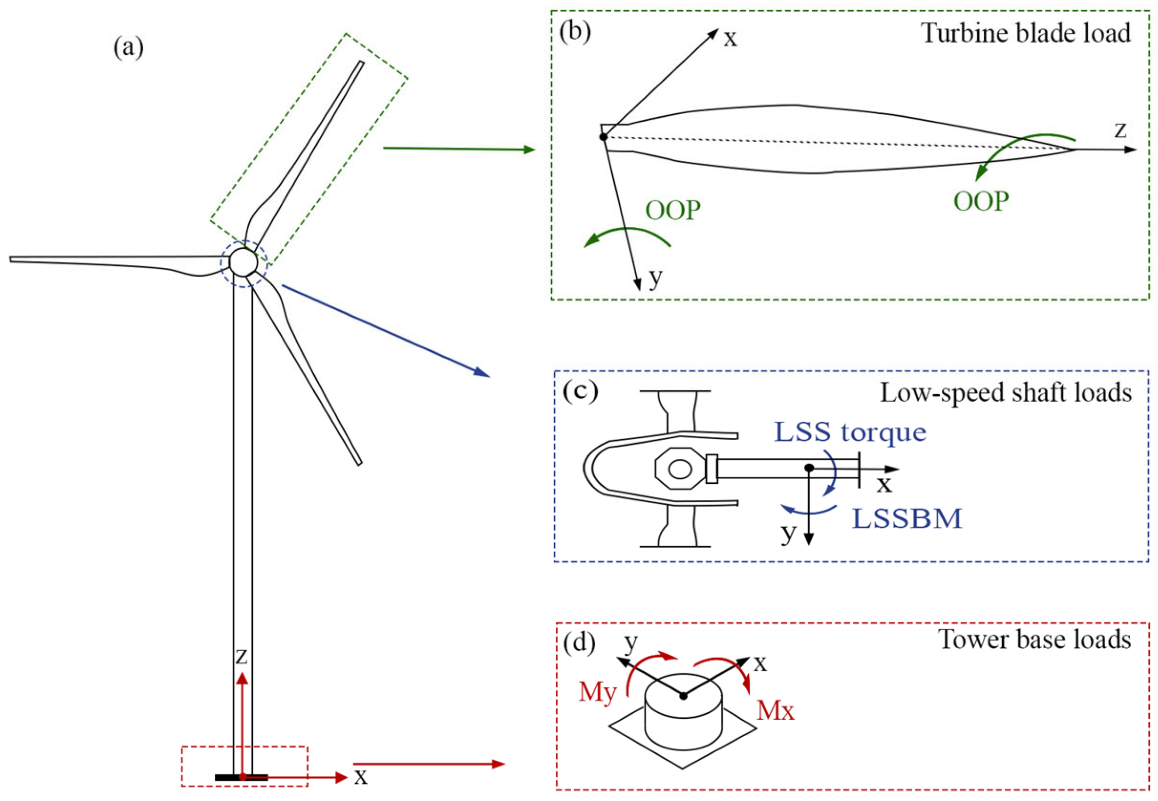 34], under representative stochastic turbulent wind conditions below and above the rated wind speeds. The analysis focuses on critical turbine components, including blade root OOP, LSS torque, LSSBM, and the resultant TBBM (combining fore-aft and side-to-side components). The loads are calculated using the nonlinear aero-servo-elastic tool OpenFAST [