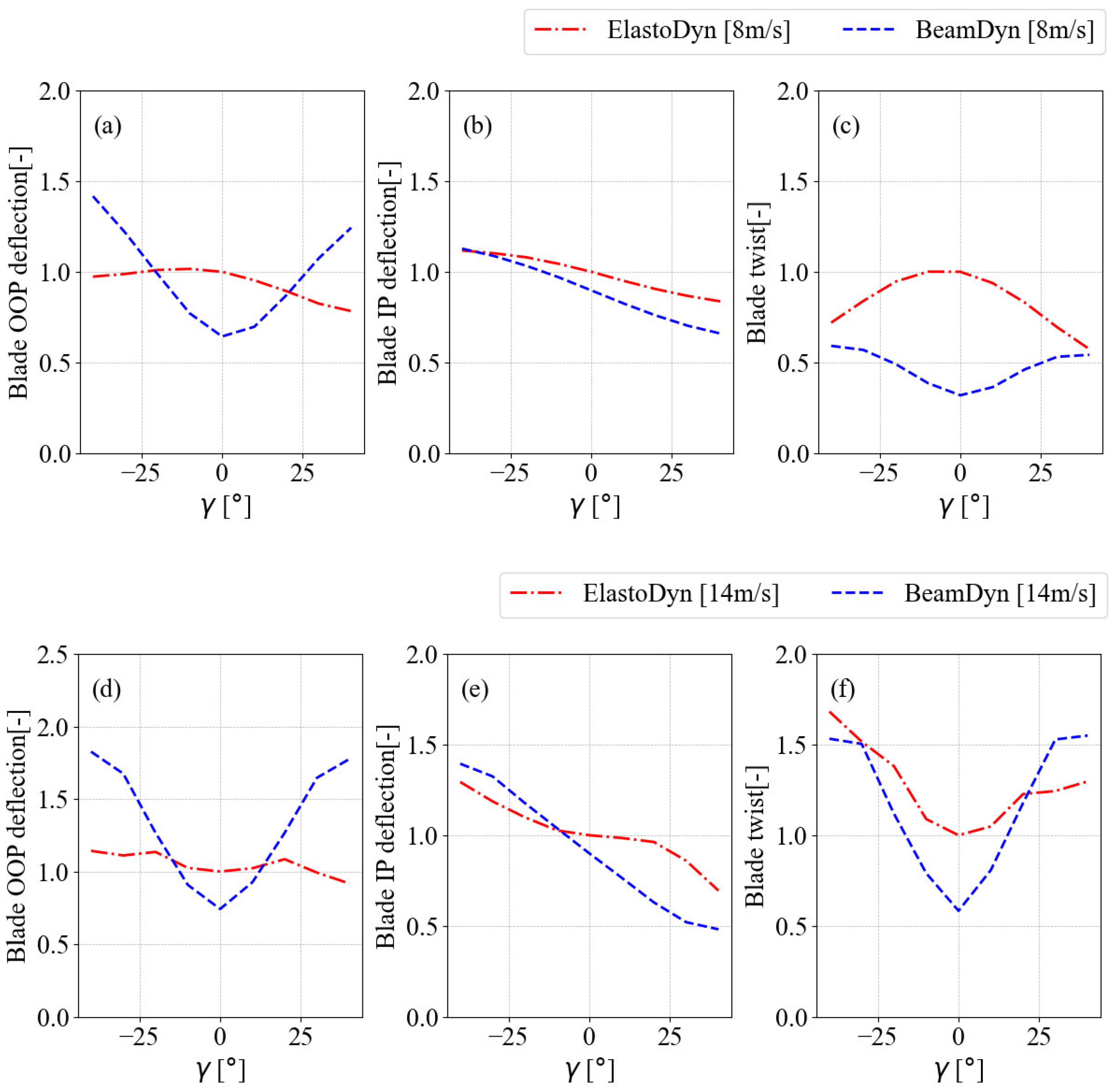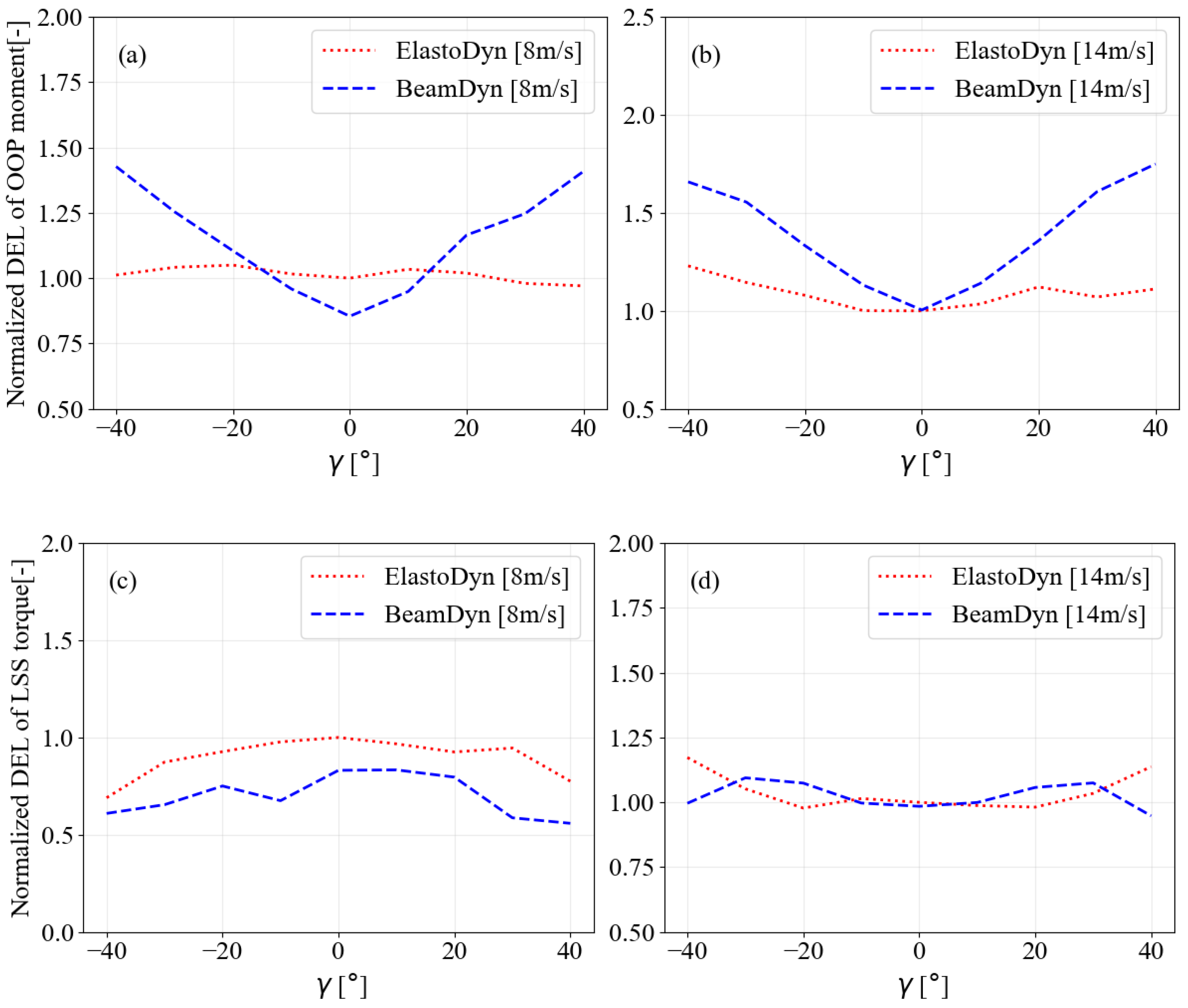 γ; however, the increase in DEL is more pronounced in the BeamDyn case compared to ElastoDyn. The discrepancies arise from the assumptions in ElastoDyn that the material is isotropic and linear elastic and that plane sections remain plane and perpendicular to the neutral axis, which limit its ability to capture the geometric nonlinearity, pre-bend, and twist of the blade sections.