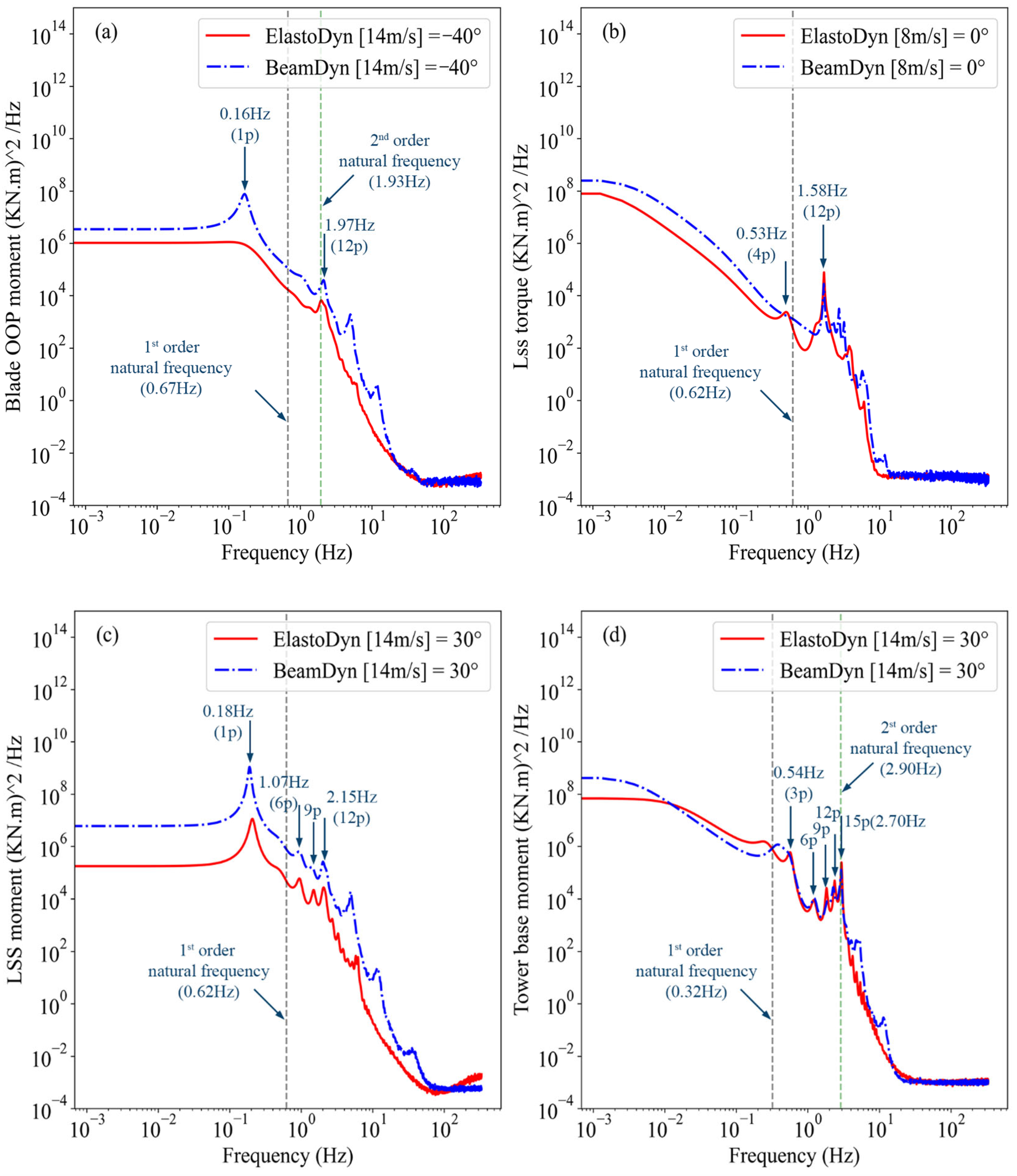 Figure 7c, the LSS moment response shows the magnitude of dominant harmonic frequency component is the largest at 1 p (0.18 Hz), decreases in the order of 6 p (1.07 Hz) and 9 p (1.61 Hz), and slightly increases at 12 p (2.15 Hz) in both cases. The first-order natural frequency (0.62 Hz) does not excite on the LSS moment, and the power spectral magnitude of the BeamDyn resonated more compared to the ElastoDyn, which cause a larger DEL, as evidenced in