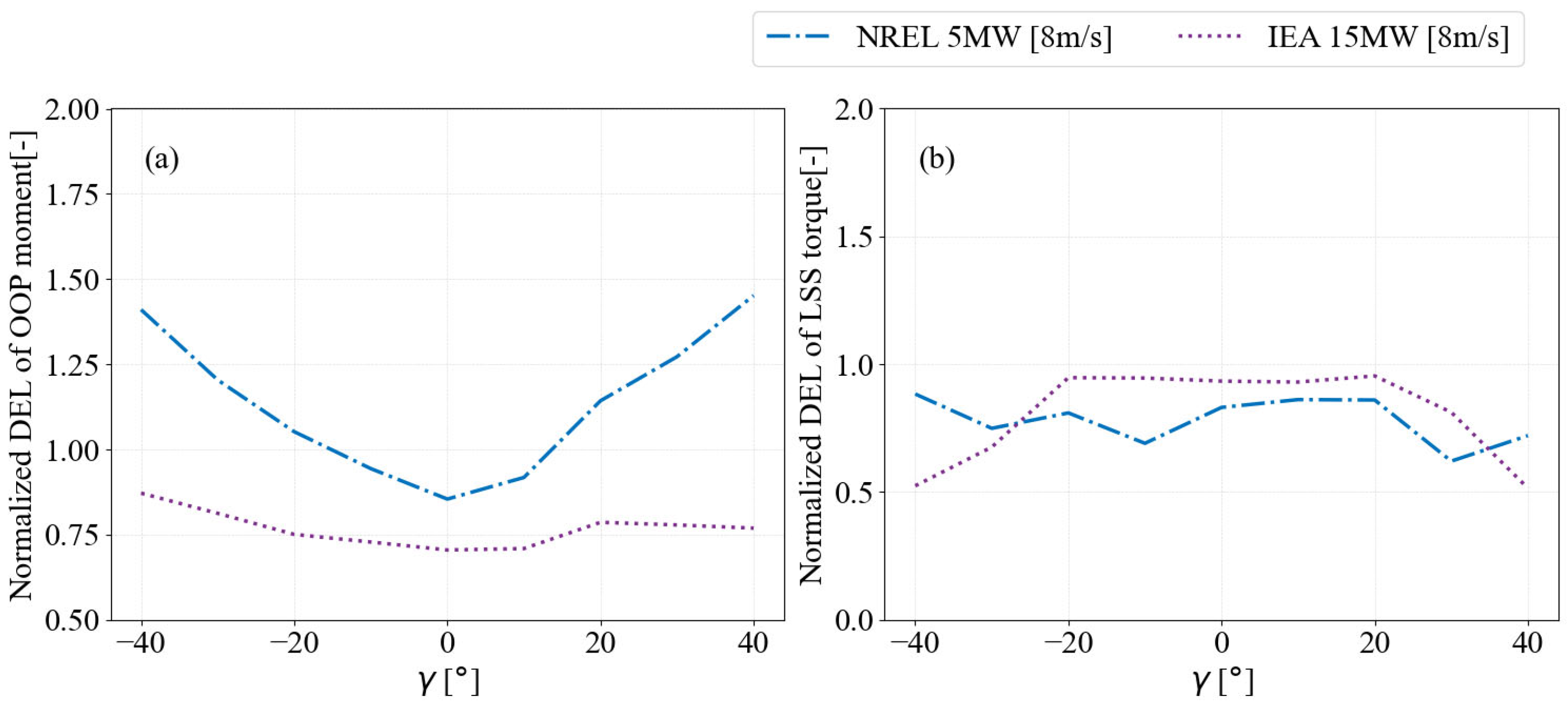 γ results in a decrease in the DEL of the tower base moment. The NREL 5 MW and IEA 15 MW models show increases of 48% and 25%, respectively, compared to their corresponding ElastoDyn fatigue loads. Although
