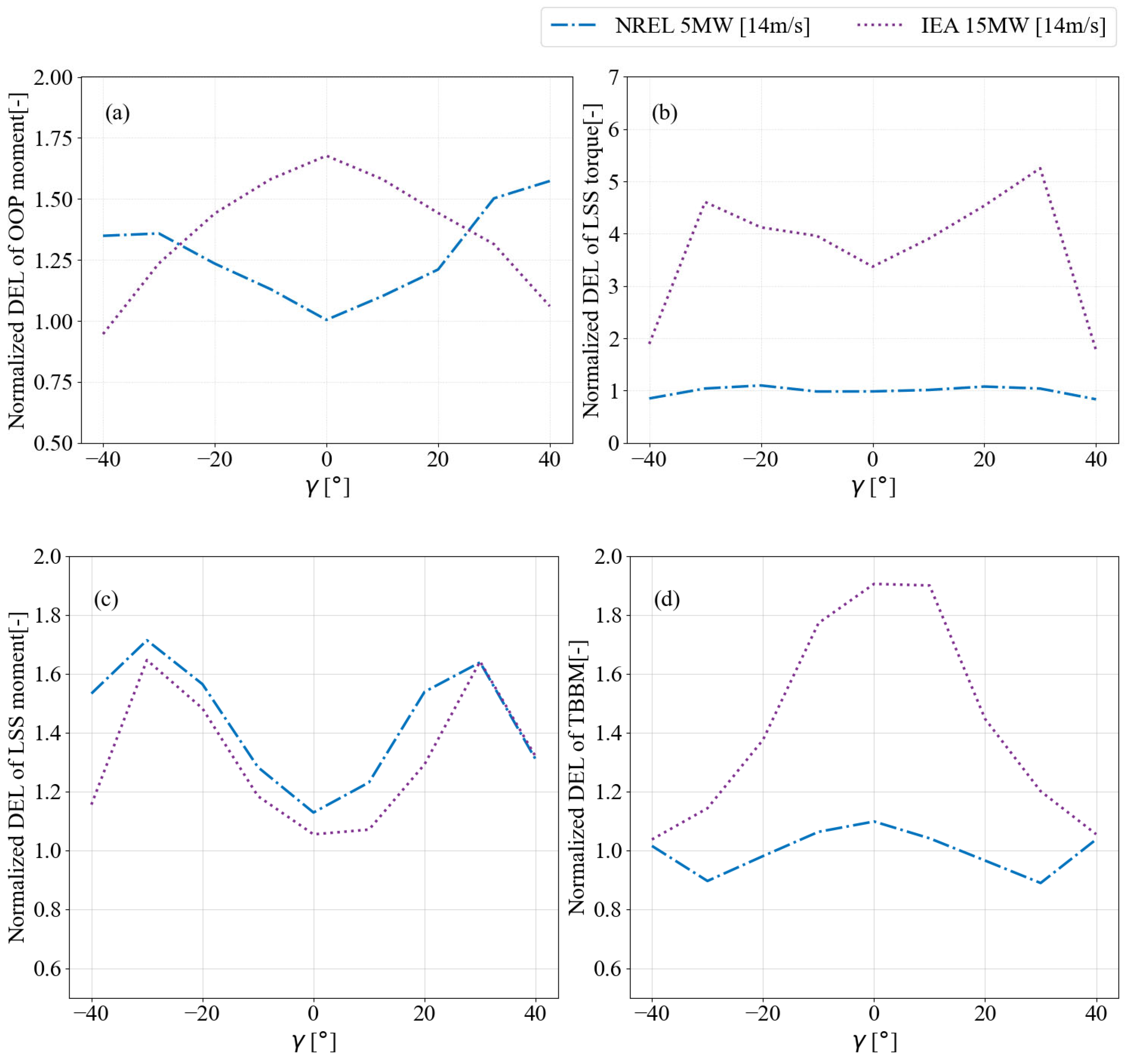 γ. However, the DEL of the NREL 5 MW model fluctuated across the change in