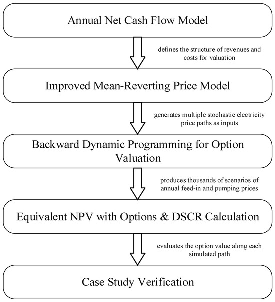 This paper first develops an annual net cash flow model for the pumped-storage hydropower plant. An improved mean-reverting electricity price model is then employed to generate stochastic trajectories of annual average feed-in prices and pumping purchase prices over the project lifetime, yielding thousands of simulated price paths. By applying backward dynamic programming, each path is evaluated for option valuation. Subsequently, the equivalent NPV incorporating real option value and the internal rate of return (IRR) are calculated, and the proposed framework is validated through a representative case study. Figure 1 shows a flowchart for the proposed method.