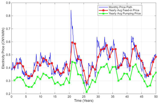 Figure 2 shows a typical electricity price simulation path for an improved mean-reversion electricity pricing model, which simulates the fluctuation in the average feed-in tariff and the average pumped purchased power tariff over the lifetime, laying the foundation for the calculation of the cash flow and the construction of the option model.