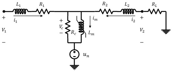 In (5), L 1 and L 2 represent the primary- and secondary-side energy storage due to winding inductance, R 1 and R 2 denote the primary- and secondary-side winding losses, R c indicates the core losses, u n is the controlled voltage source on the neutral, v 1 is the primary-side voltage, and v 2 is the secondary-side voltage, given by v 2 = i 2 R L , where R L is the resistive load connected to the transformer. The term i m represents a nonlinear current through the core and is approximated as